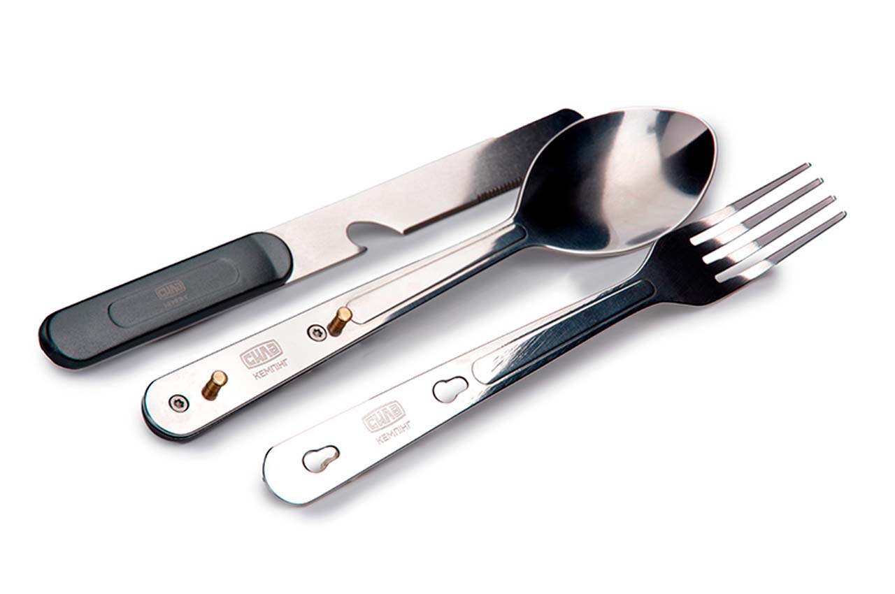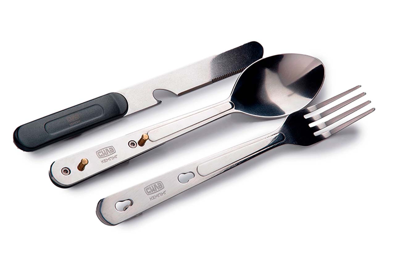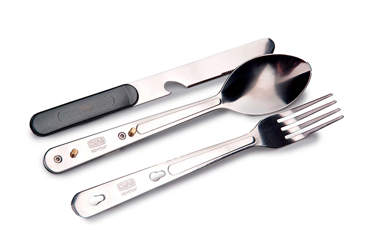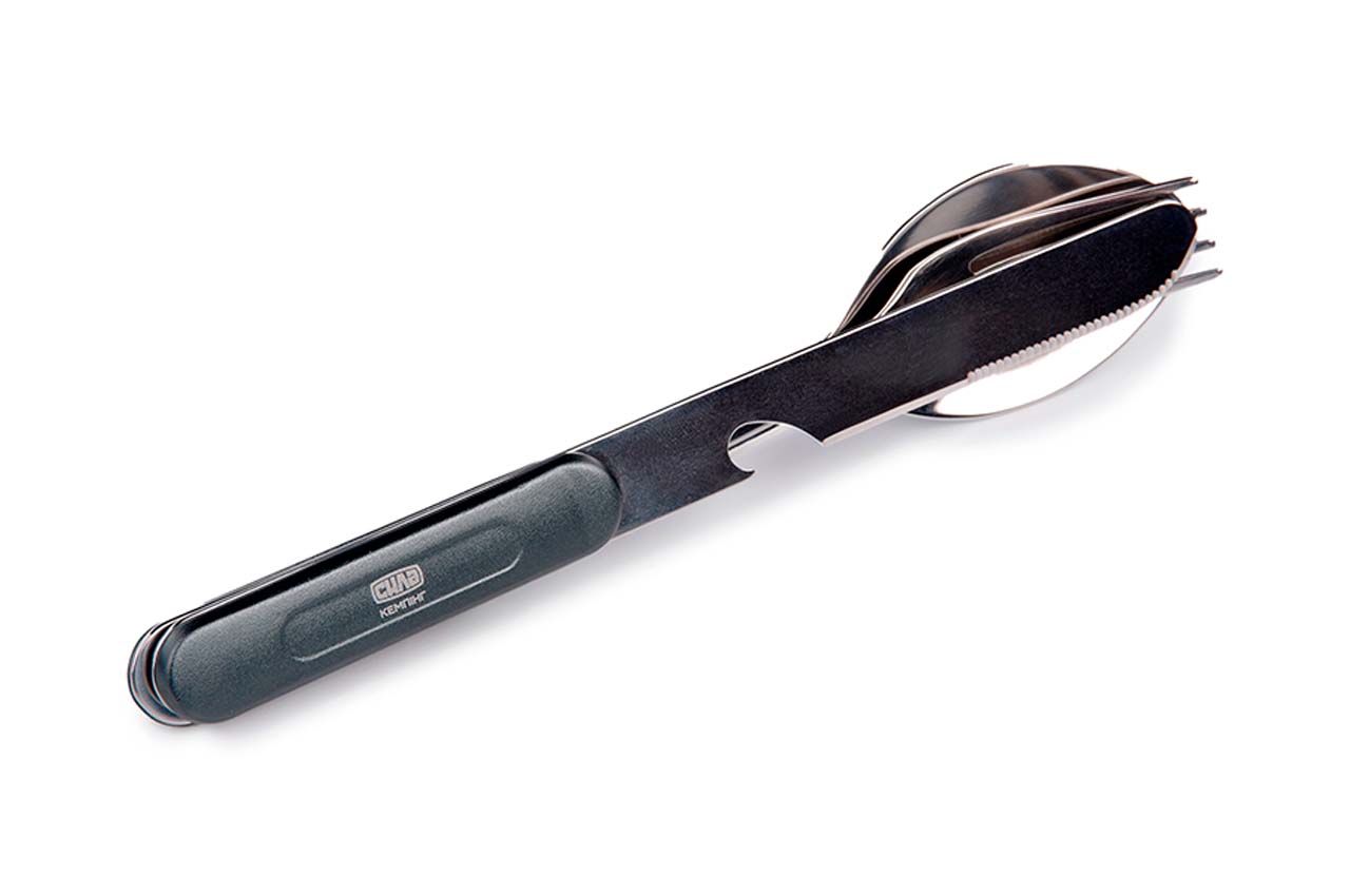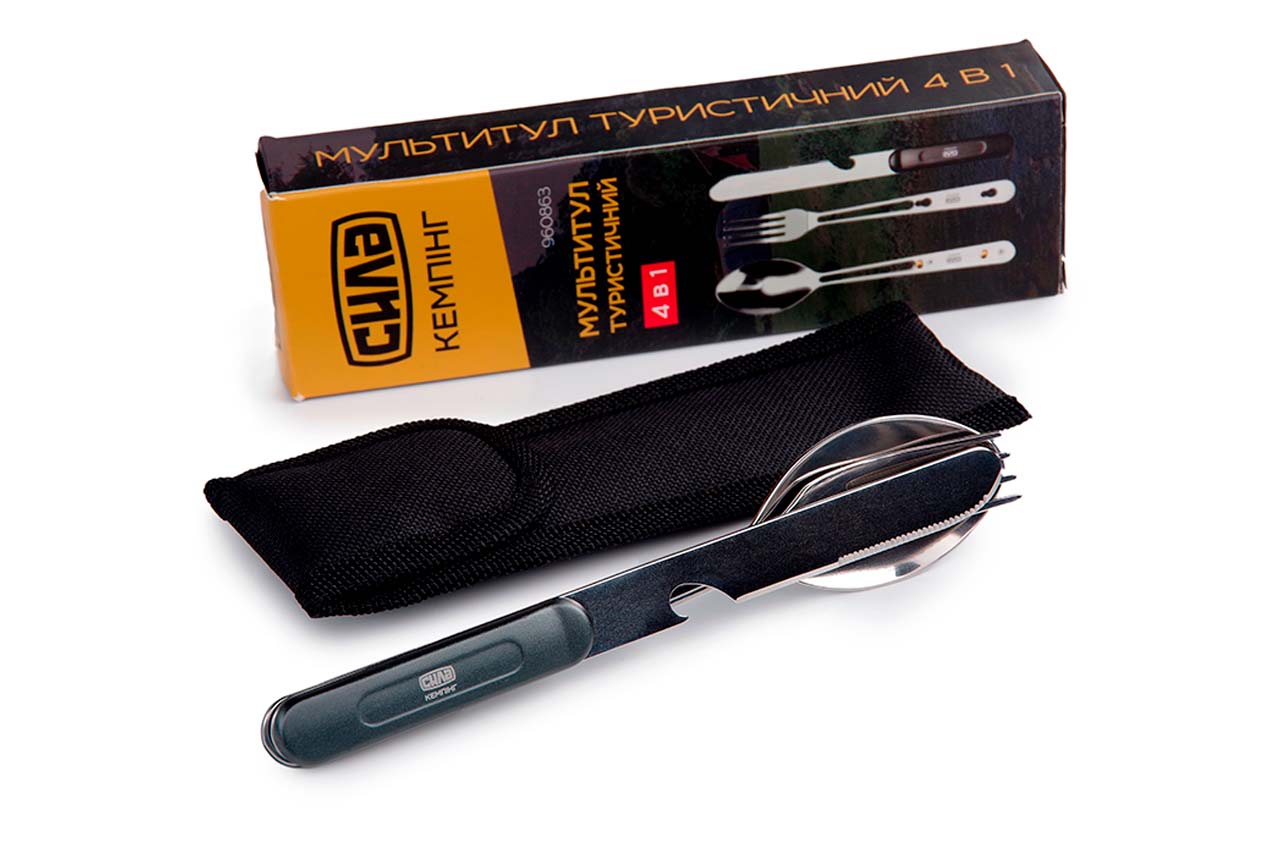 Мультитул Сила - 4-в-1. Комплектация: нож; ложка; вилка; открывашка бутылок.
