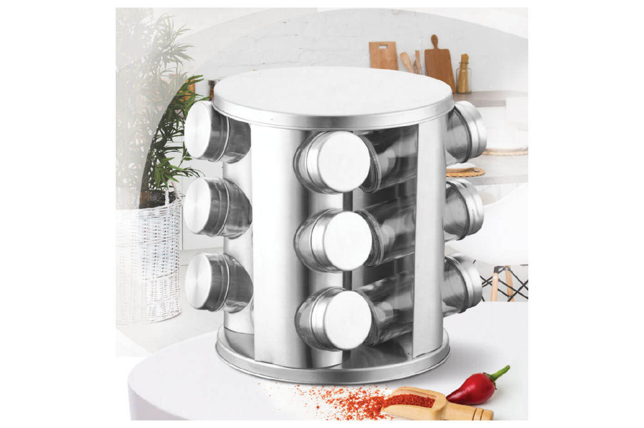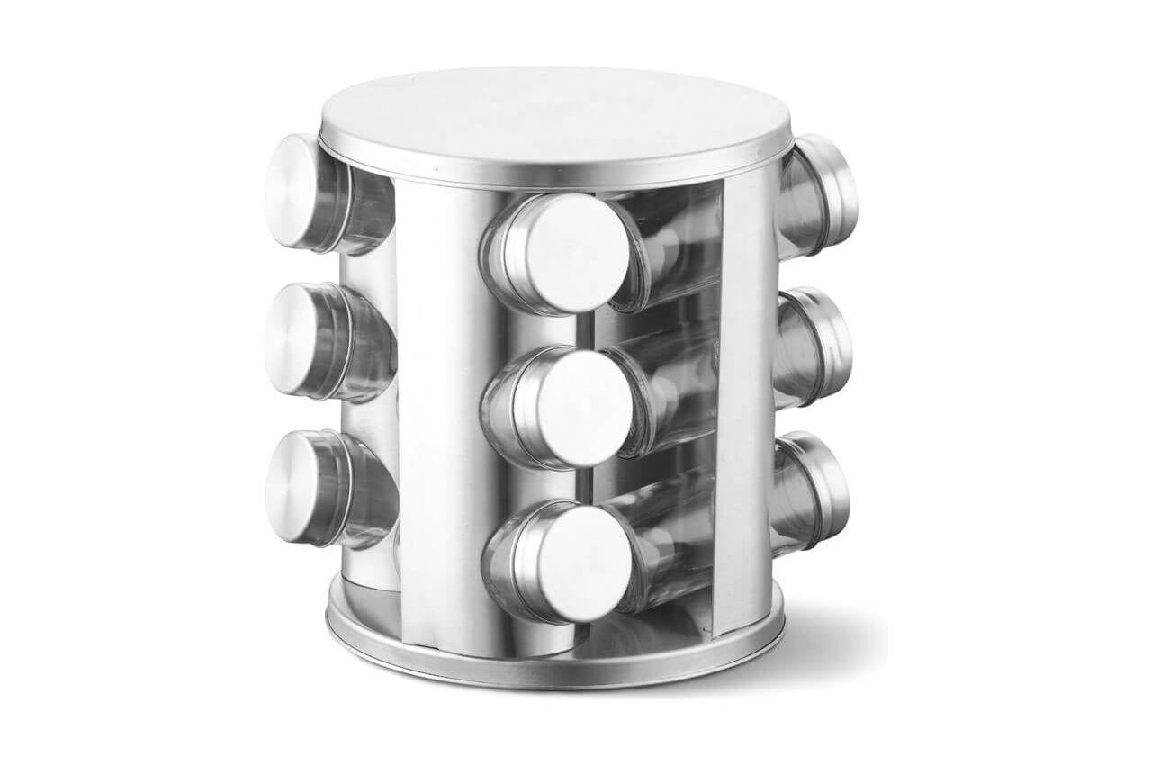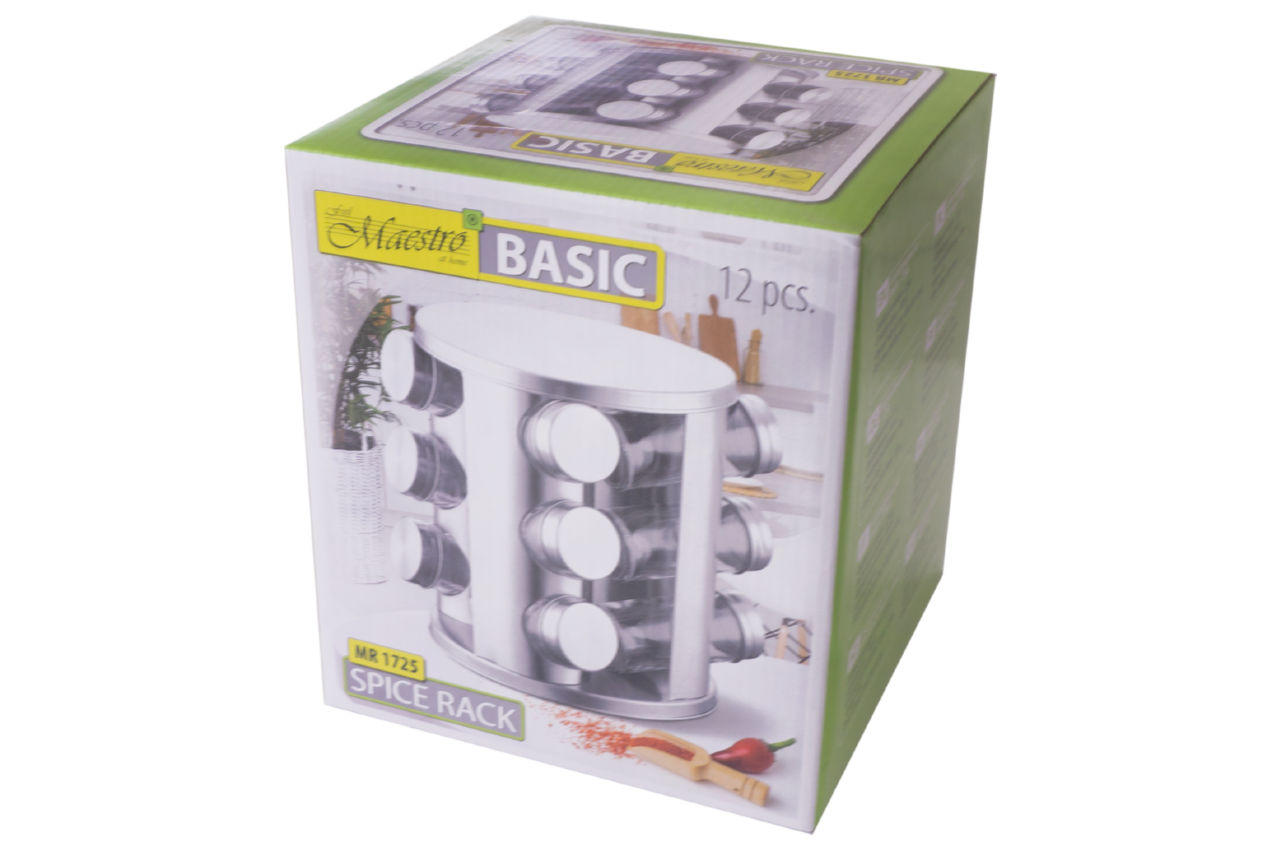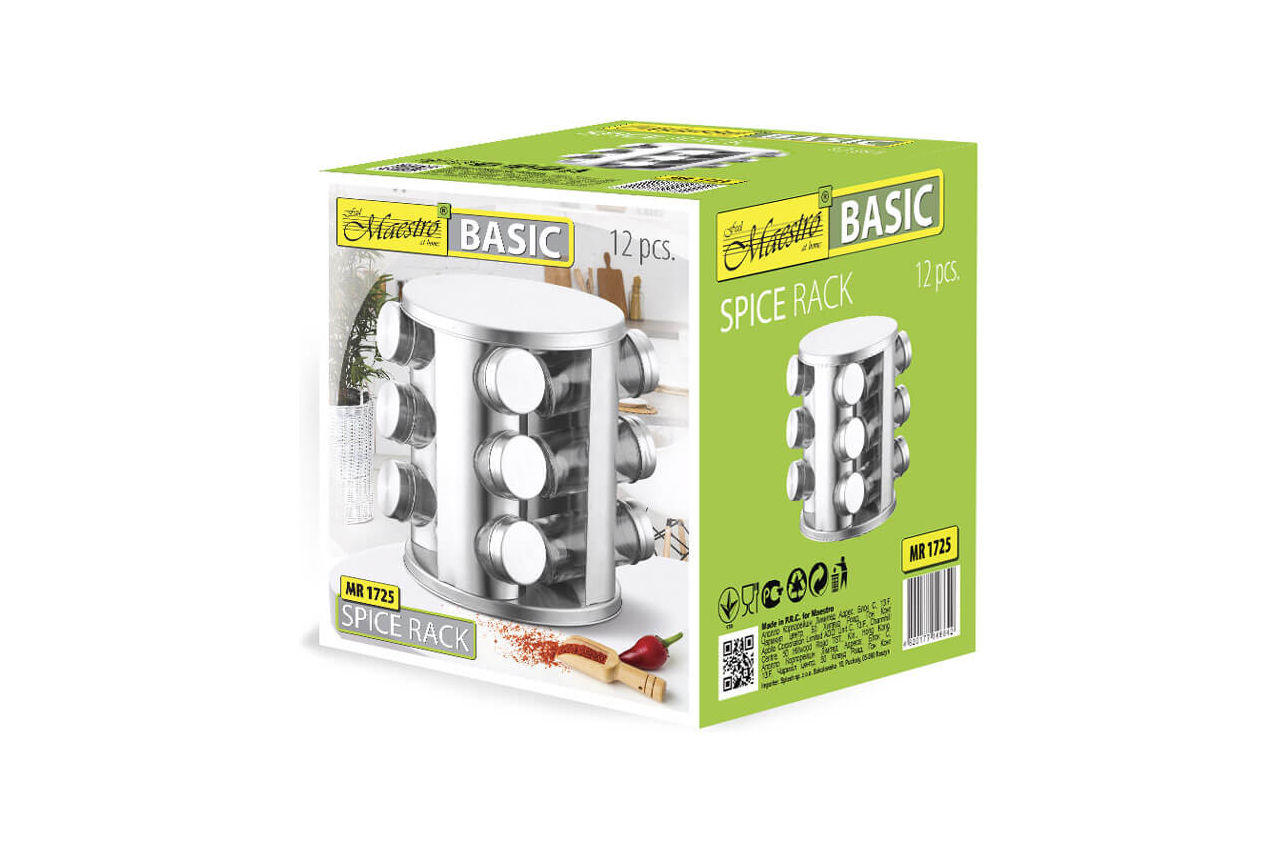 Набор Maestro MR 1725 состоит из 12 ёмкостей для специй объёмом 100 мл на стойке, баночки изготовлены из стекла с закручивающейся стальной крышкой. Удобно размещаются в четыре ряда (по 3 штуки в ряду) на стальной подставке с сатиновой полировкой.
