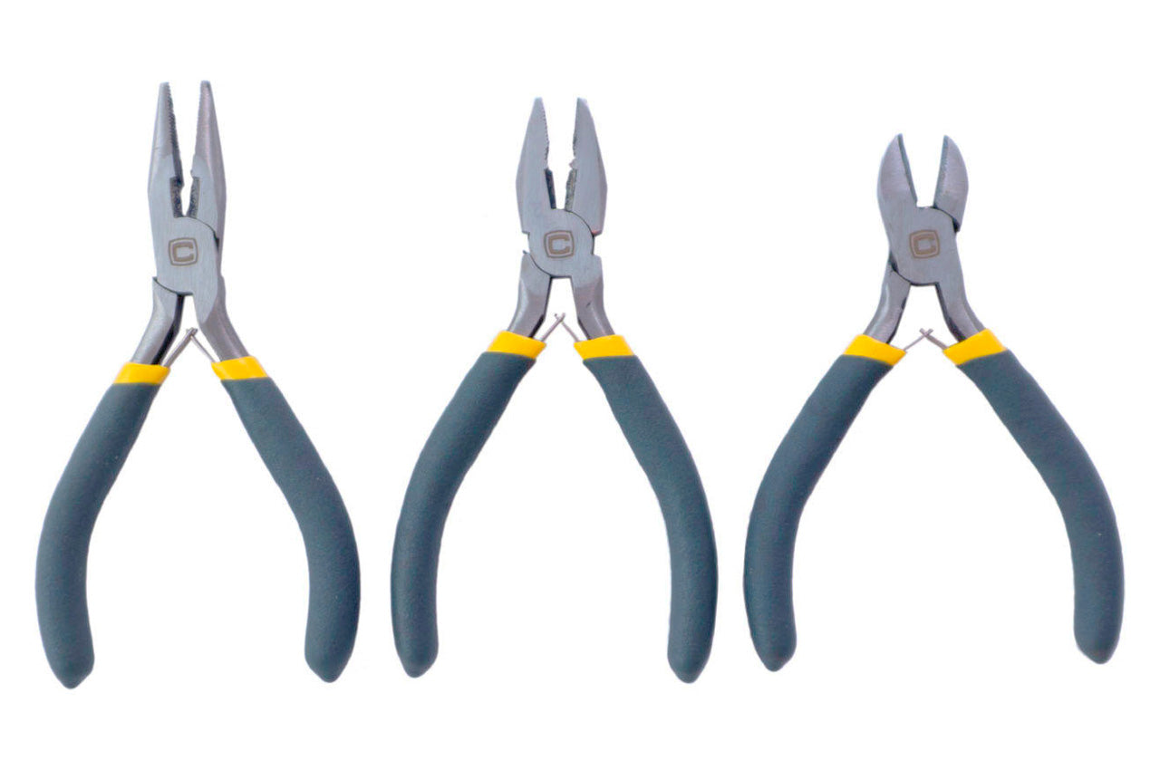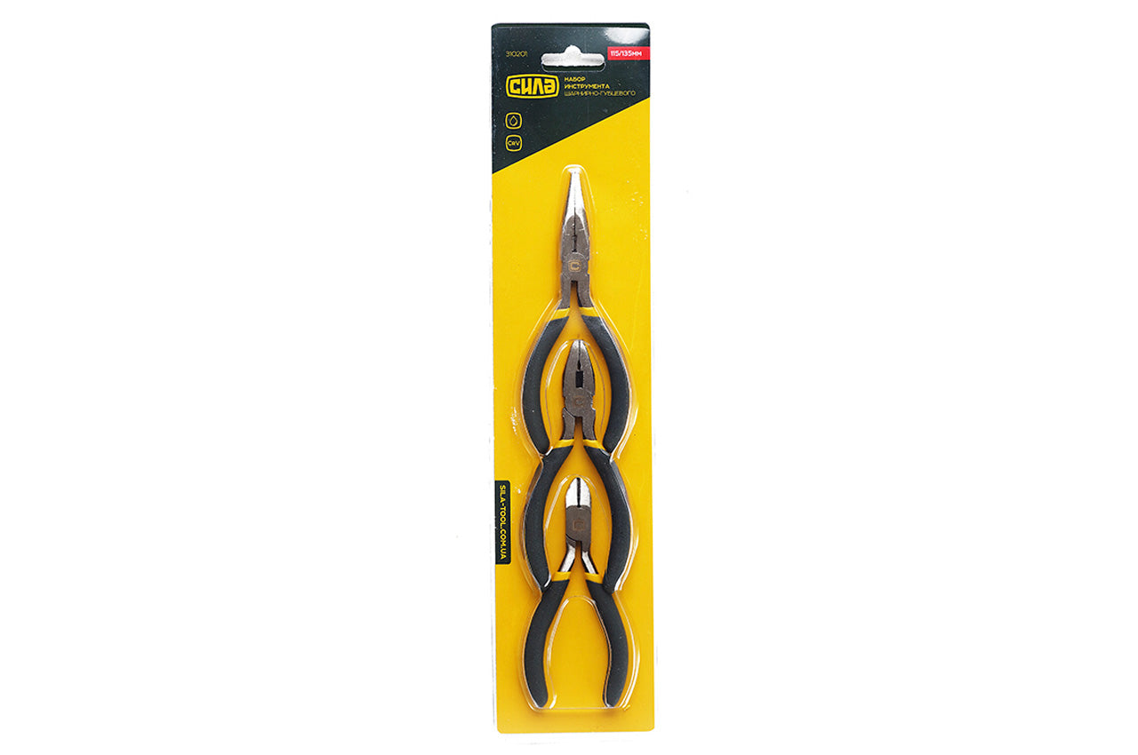 Набор: плоскогубцы 115мм; бокорезы 115мм; длинногубцы 135мм. Материал рукоятки: термопластичная резина. Материал: инструментальная сталь. Материал рукоятки: термопластичная резина; Набор: плоскогубцы 115мм; бокорезы 115мм; длинногубцы 135мм