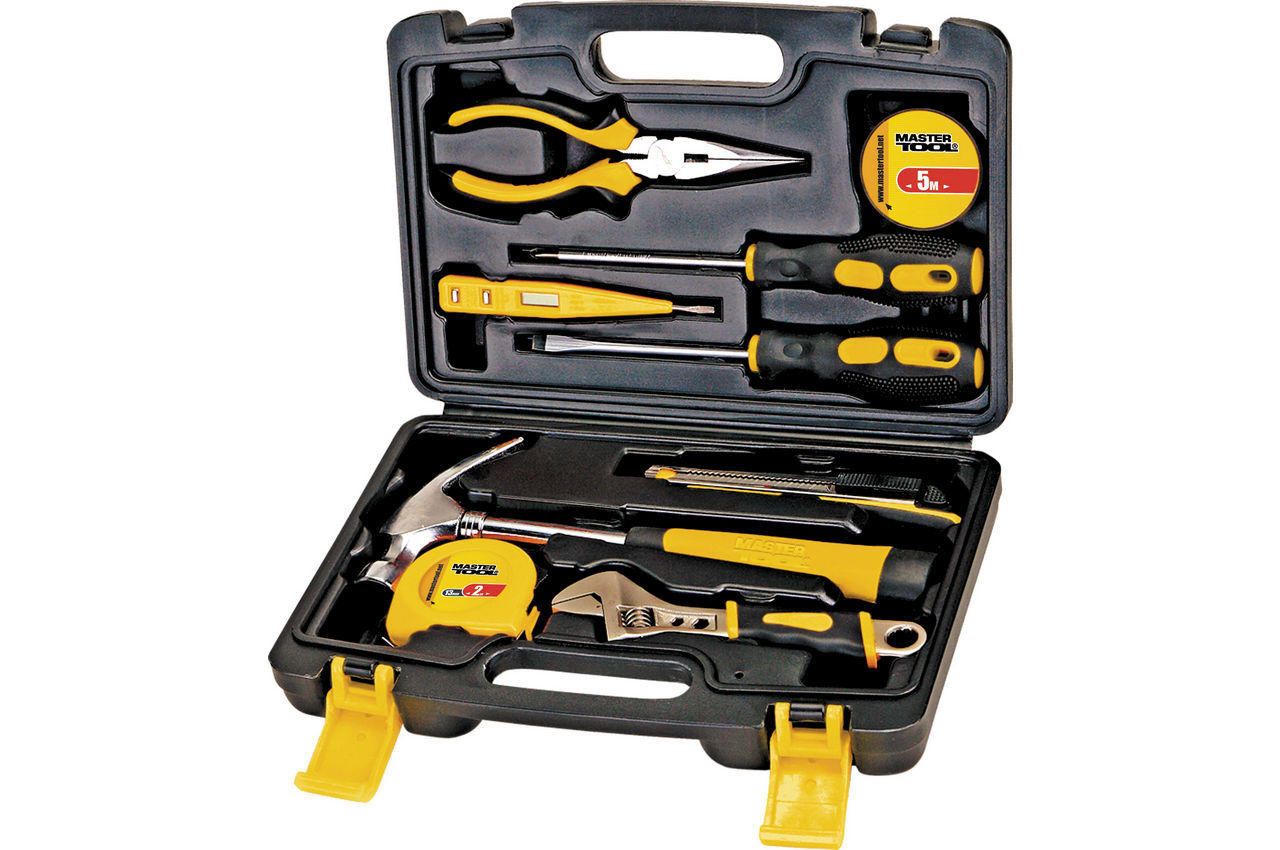 В наборе: щипцы 160 мм, ключ разводной 160 мм, отвертка - пробник с жк-дисплеем, молоток 250 г, рулетка 2 м х 13 мм, нож, лезвие 18 мм, изолента 5 м х 16 мм, отвертка SL6 x 100 мм, отвертка РН2 х 100 мм.