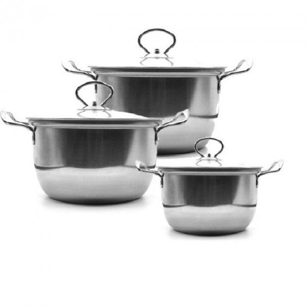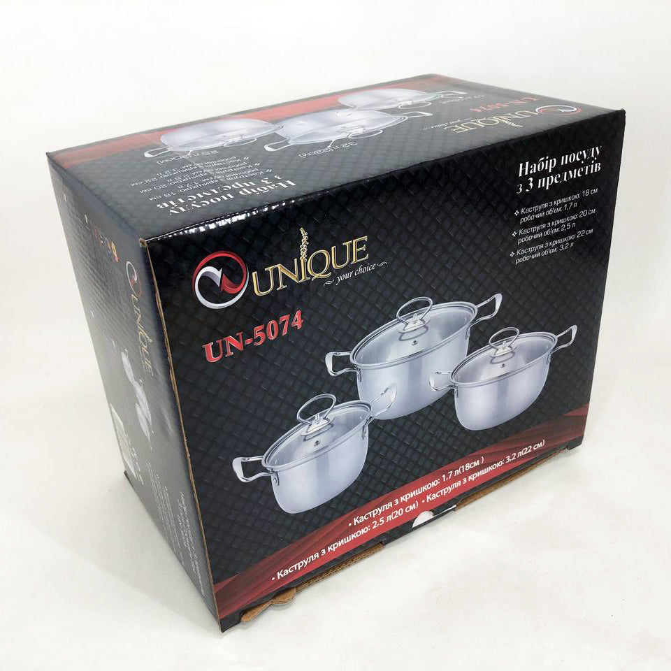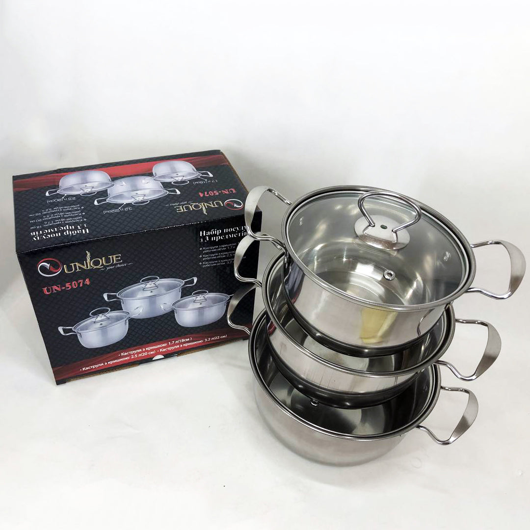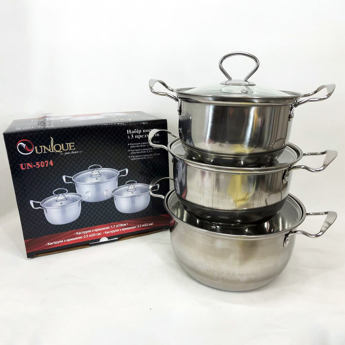Набор из трёх кастрюль UNIQUE UN-5074 с крышками 18,20,22 см содержит в себе кастрюли, которые быстро нагреваются, равномерно распределяя тепло по всей площади основания и долго хранят тепло. Набор посуды прекрасно подойдет для всех видов плит, кроме индукционных. На крышках и по бокам кастрюль расположены клепаные, не нагревающиеся ручки. Прозрачные крышки из жаропрочного стекла позволит наблюдать за всем процессом приготовления пищи от самого начала и до конца, стекло крышки не будет запотевать, так как имеет отверстие для выхода пара.