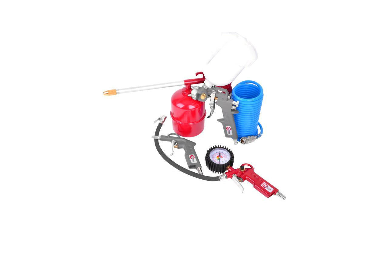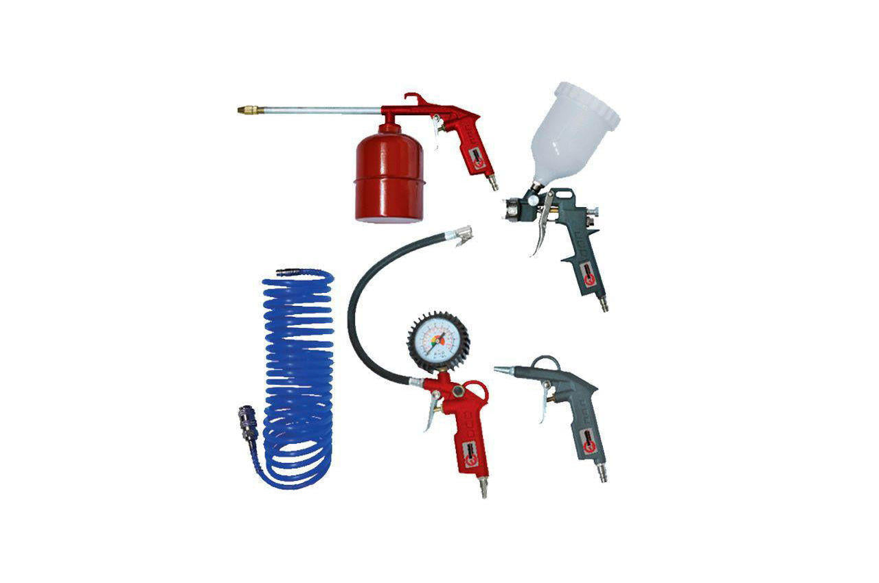 Набор покрасочный пневматический РТ-1502 состоит из пяти единиц. Он отлично подойдет для автомобильной мастерской, небольшого цеха, автомойки или гаража. В состав набора РТ-1502 входят: краскопульт, предназначенный для окрашивания предметов из дерева, металла или пластмассы, пистолет, который может распылять различные жидкости, пистолет продувочный, пистолет для накачивания шин и шланг спиральный из полиуретана (5 м). Полиуретановый шланг характеризуется эластичностью и износостойкостью, а также имеет широкий диапазон рабочих температур. Все инструменты набора оснащены быстроразъемными соединениями, что обеспечивает удобство его эксплуатации. Количество в наборе: 5 ед.; Диаметр форсунки: 1.5 мм; Длина шланга: 5 м, спиральный полиуретановый; Диаметр шланга: 6-8 мм