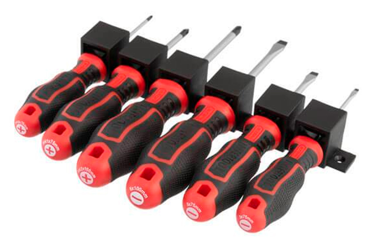Профессиональный набор отверток STORM изготовлен по последним технологиям и соответствует высоким запросам мастеров. Отвертки предназначены для интенсивной работы на СТО, в мастерских, в точках сервисного обслуживания и в других отраслях, где необходимо проводить постоянные работы с применением высоких нагрузок. Также этот набор станет отличным помощником в домашнем арсенале инструмента и прослужит вам долгие годы! Высокое качество стали Стержень отвертки изготовлен из высокопрочной стали S2, которая считается лучшей в своем сегменте. В составе этой стали присутствуют молибден и кремний, которые придают изделию высокое сопротивление к нагрузкам и низкий порог обратимой деформации. Также сталь S2 обладает высокой антикоррозийной стойкостью. Конструкция отверток продумана до мелочей Стержень глубоко посажен в рукоятку и крепиться в двух местах, что исключает возможность срыва. Намагниченный наконечник Отвертки имеют высокопрочный магнитный наконечник, который позволяет комфортно устанавливать и демонтировать крепеж. Он устойчив к истиранию граней и предназначен для проведения работ с высокой нагрузкой. Удобная рукоятка Форма ручек обеспечивает максимальную эффективность от приложенного усилия. Трехкомпонентная рукоятка изготовлена из термопластичной резины (TRP) и гарантирует комфорт при работе даже влажными или скользкими руками. Легкая, прочная, бензомаслостойкая ручка удобно лежит в ладони во время работы. Яркая маркировка на конце рукоятки позволяет быстро найти необходимый тип и размер отвертки. Комплектация Отвертки: SL3*75мм, SL5*75мм, SL6*100мм, PH0*75мм, PH1*75мм, PH2*100мм. Длина отвертки: 75, 100 мм; Количество в наборе: 6 ед.; Материал рукоятки: TPR резина; Материал стержня отвертки: сталь S2
