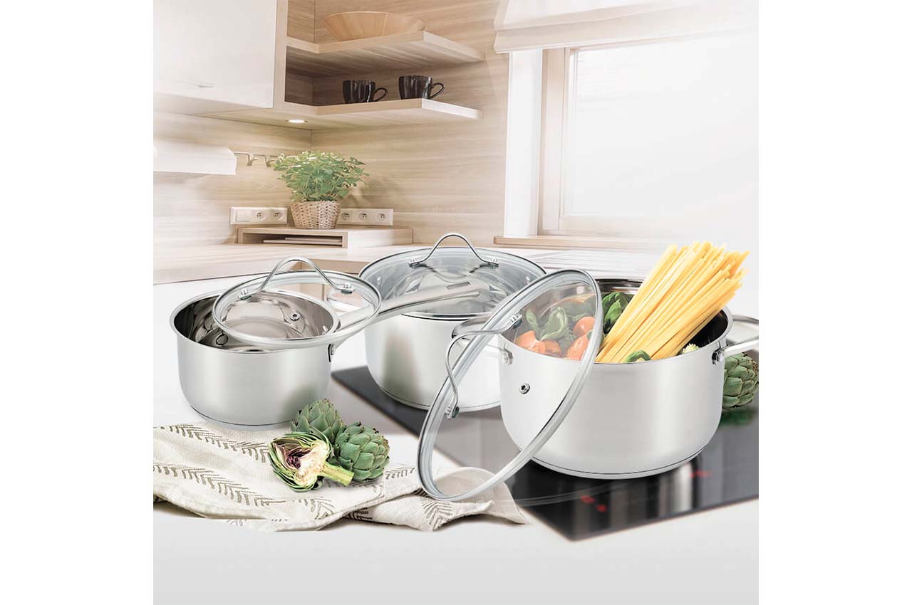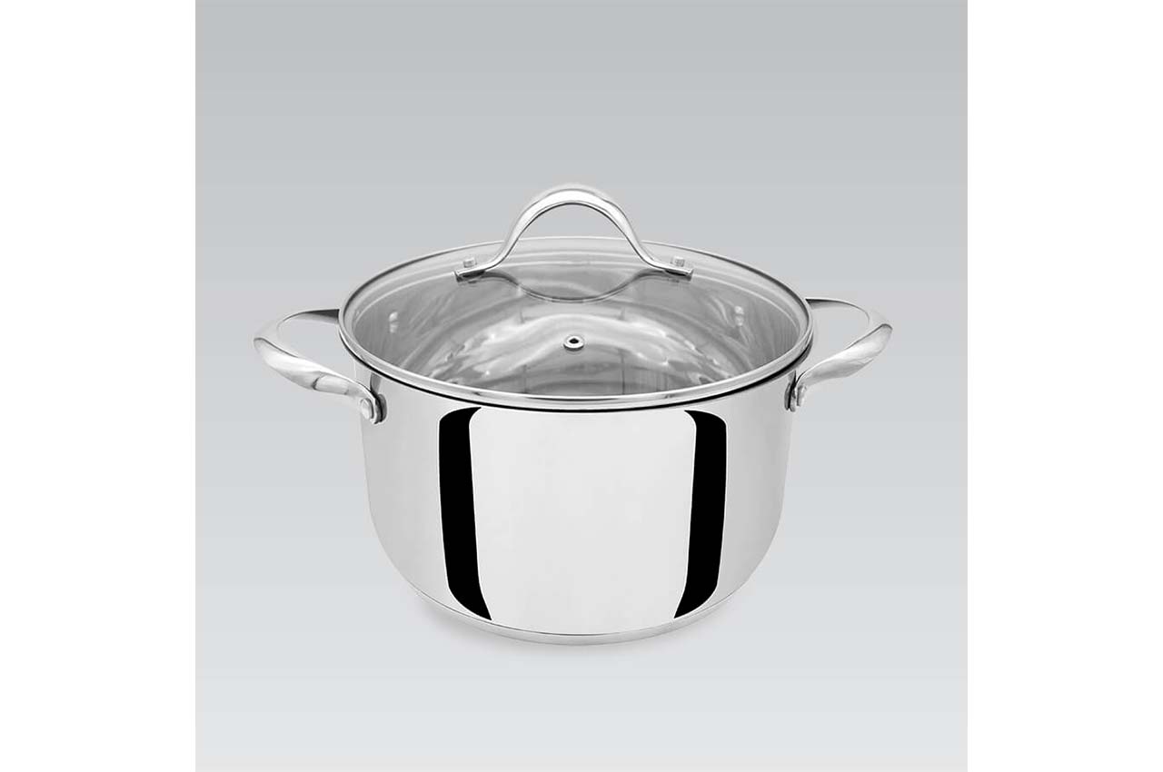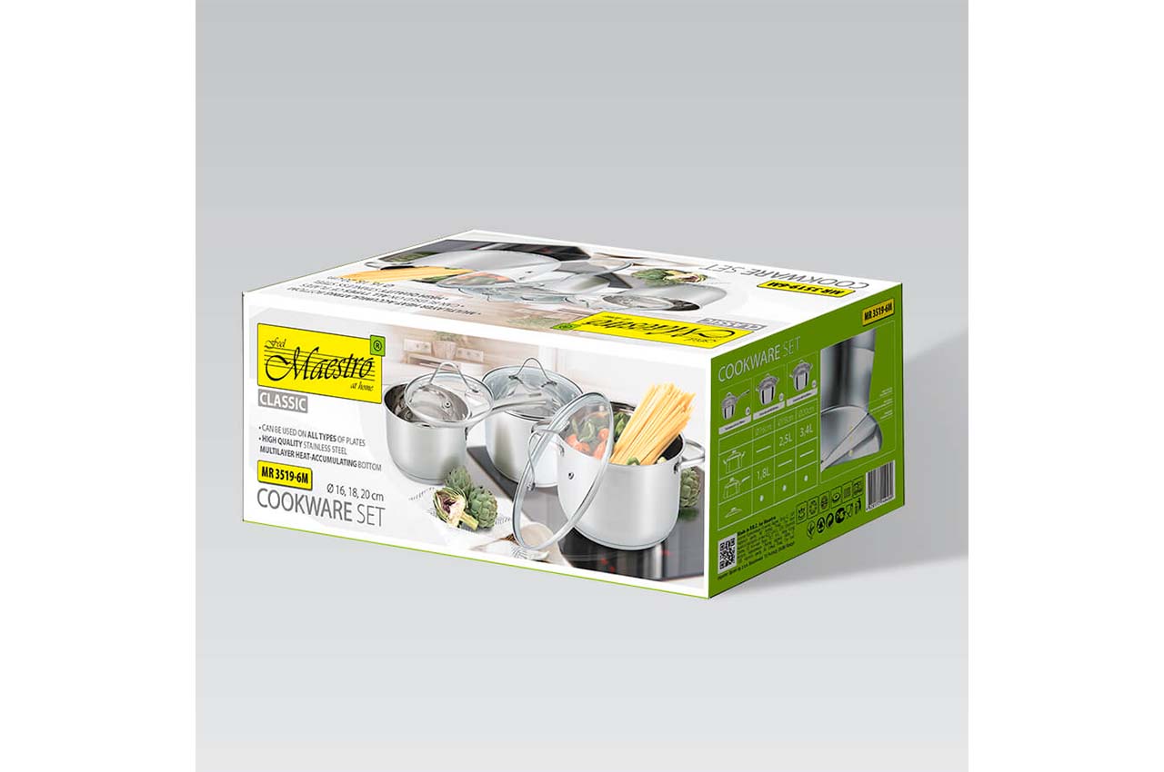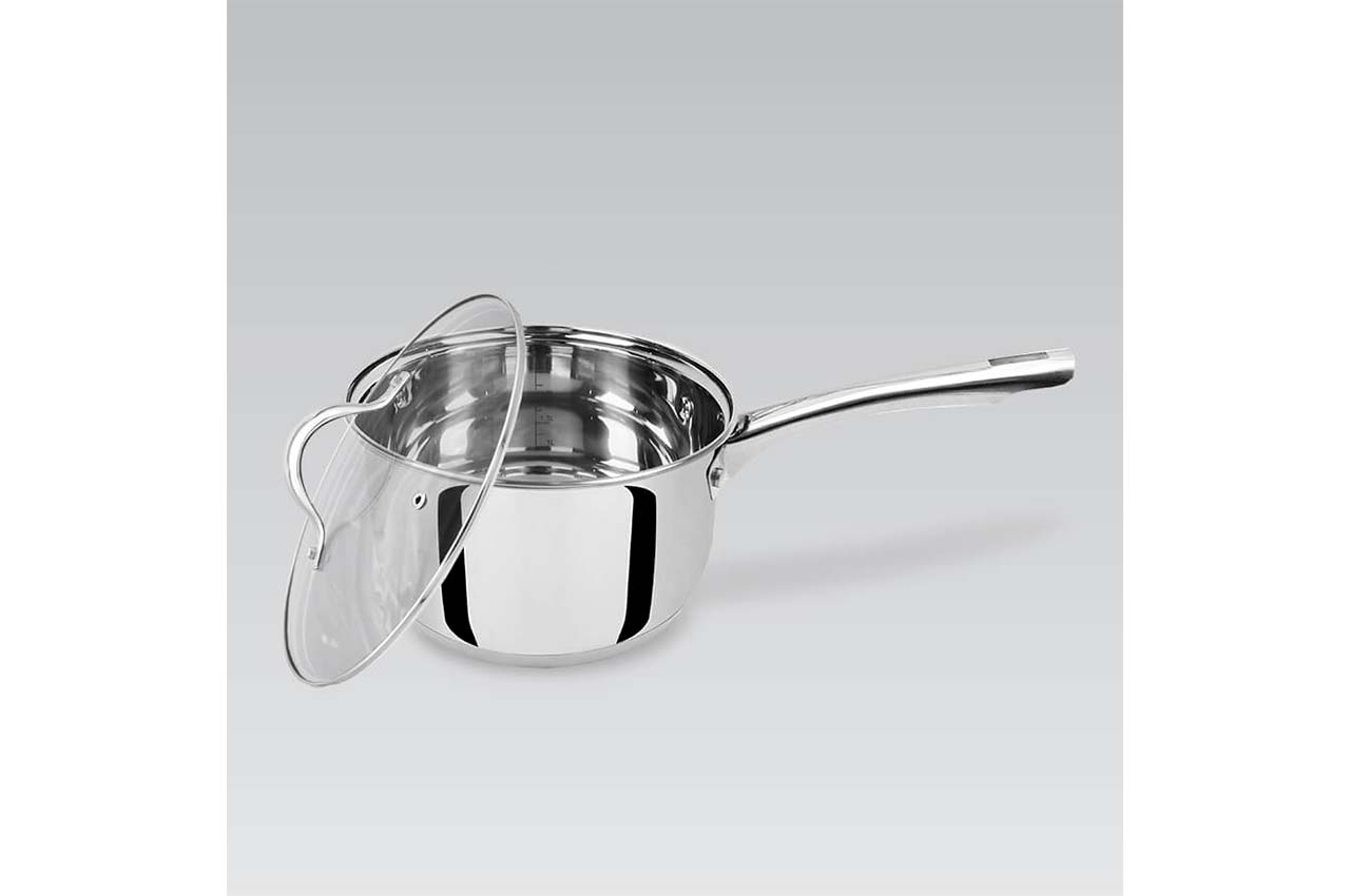 Почти весь модельный ряд Maestro MR 3519 можно приобрести в одном наборе - MR 3519-6M . Не хватает только смаой большой модели, ее можно купить отдельно. Кастрюли выполнены в современном дизайне. Полировка зеркальная, кастрюлька заужена к низу, что придает ей изящества.Есть шкала уровня жидкости. Ручки на заклепках.