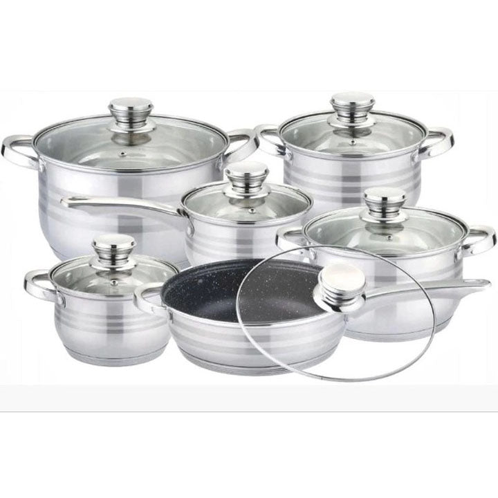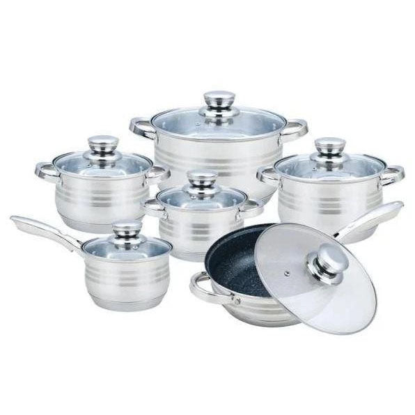 Набор состоит с 12 предметов: 4 кастрюли,1 ковш и вместительная сковорода с черным антипригарным покрытием. Все предметы изготовлены с высококачественной нержавеющей стали и укомплектованы термостойкими стеклянными крышками с паровыпуском. Ручки крепятся надежными заклепками, которые славятся своей долговечностью.