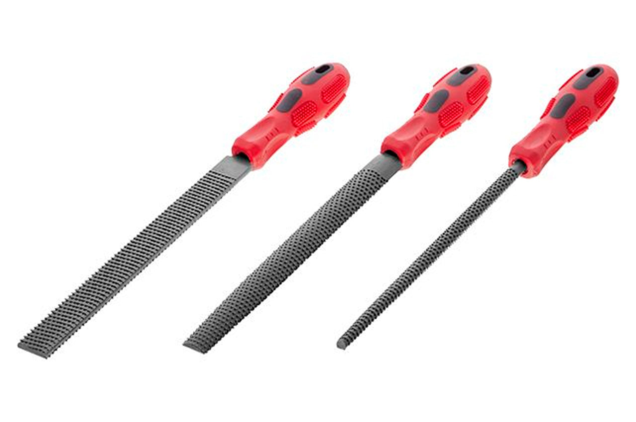 В набор входят рашпили с прямоугольным, треугольным и круглым профилем. Удобные пластиковые рукоятки, покрыты резиновыми накладками. Плотность насечки - 12 зуб/см². Предназначены для обработки древесины, фанеры, ДСП, пластмассы и других мягких материалов. Частота насечки: 12 зуб/кв.см; Форма рашпилей в наборе: прямоугольный, полукруглый, круглый; Покрытие рукоятки: резина; Количество в упаковке: 3 ед.