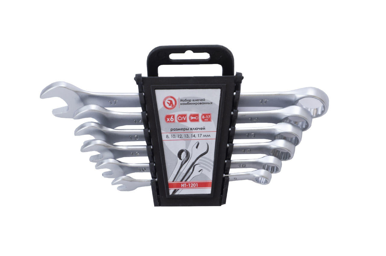 Набор из шести рожково-накидных ключей. Размерная линейка: 8, 10, 12, 13, 14 и 17 мм. Ключи поставляются в удобном пластиковом держателе с отверстием для подвешивания. Хром-ванадиевая сталь. Количество ключей в наборе: 6 ед.; Размеры: 8-17 мм