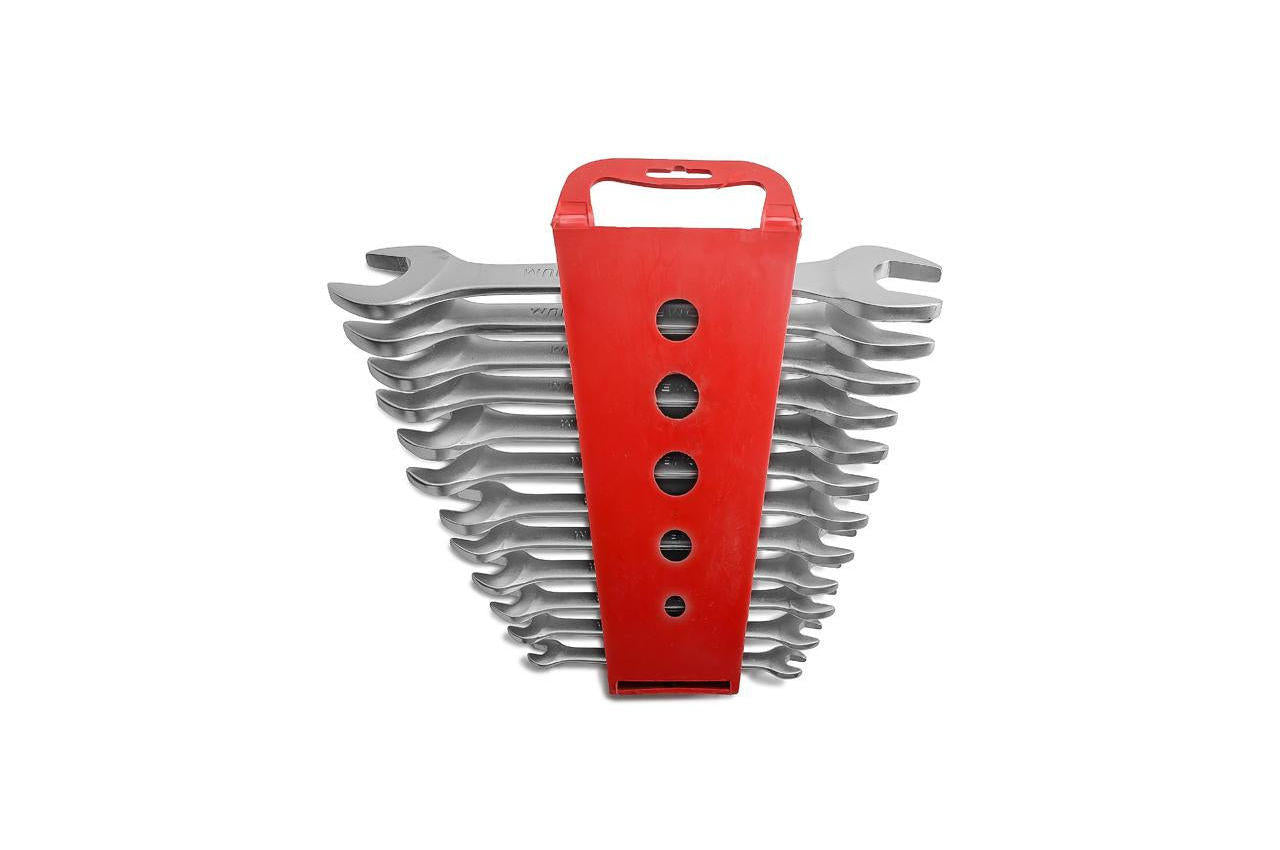 Набор из десяти качественно выполненных рожковых ключей. Размерная линейка: 6х7, 8х9, 10х11, 12х13, 14х15, 16х17, 18х19, 20х22, 21х23, 24х27, 25х28 и 30х32 мм. Ключи поставляются в удобном пластиковом держателе с отверстием для подвешивания. Хром-ванадиевая сталь. Количество ключей в наборе: 12 ед.; Размеры: 6-32 мм
