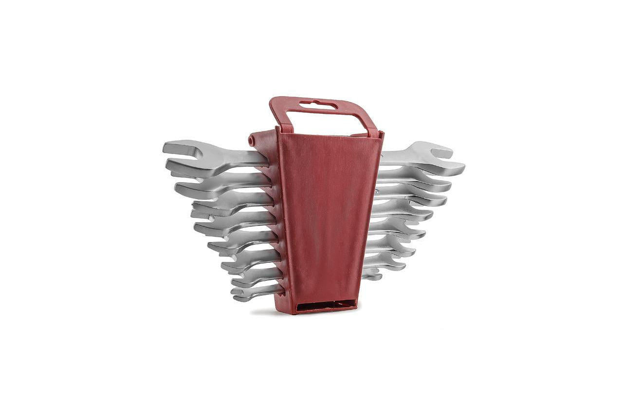 Набор из восьми качественно выполненных рожковых ключей. Размерная линейка: 6х7, 8х9, 10х11, 12х13, 14х15, 16х17, 18х19 и 20х22 мм. Ключи поставляются в удобном пластиковом держателе с отверстием для подвешивания. Хром-ванадиевая сталь. Количество ключей в наборе: 8 ед.; Размеры: 6-22 мм