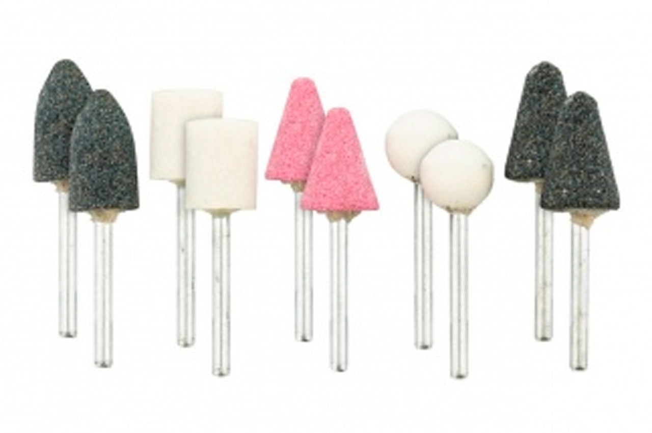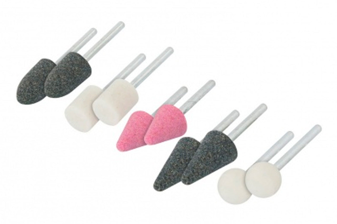 Набор шлифовальных камней "Mastertool" в количестве 10 шт. (по 2 шт. каждого вида) применяется для ручных слесарных работ по внутреннему шлифованию, снятию заусенцев и зачистке фасонных поверхностей, где не могут быть применены шлифовальные круги. Область работ: металл, дерево, гранит. Диаметр стержня 3 мм