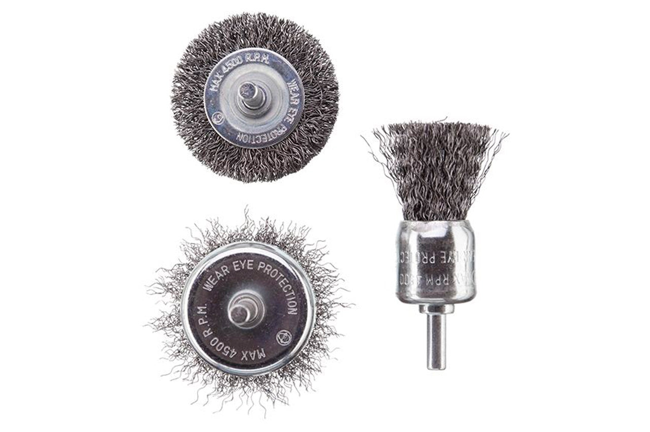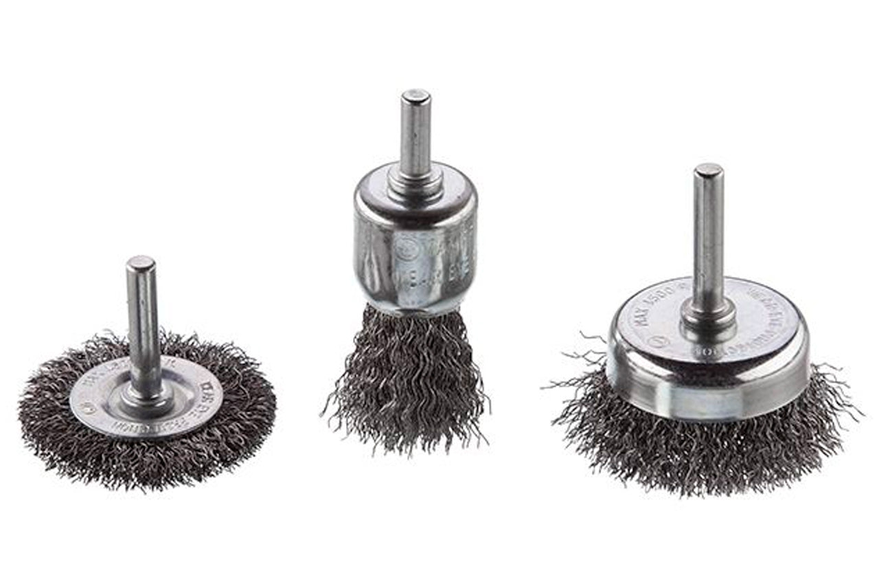 Применяется длязачистки поверхностей от лакокрасочных покрытий, ржавчины, окалины и различных загрязнений. В наборе 3 щетки: 30 мм - кистевая; 50 мм - торцевая; 50 мм - дисковая. Хвостовик - 6 мм. Форма щетки: щетка кольцеваящетка чашечнаящетка торцевая; Диаметр щетки: 505030 мм; Тип проволоки: рифленная проволока; Скорость вращения: 4500 об/мин; Диаметр проволоки: 0.3 мм; Диаметр стержня: 6 мм; Количество в упаковке: 3 ед.; Применение: для бетона, дерева и металла