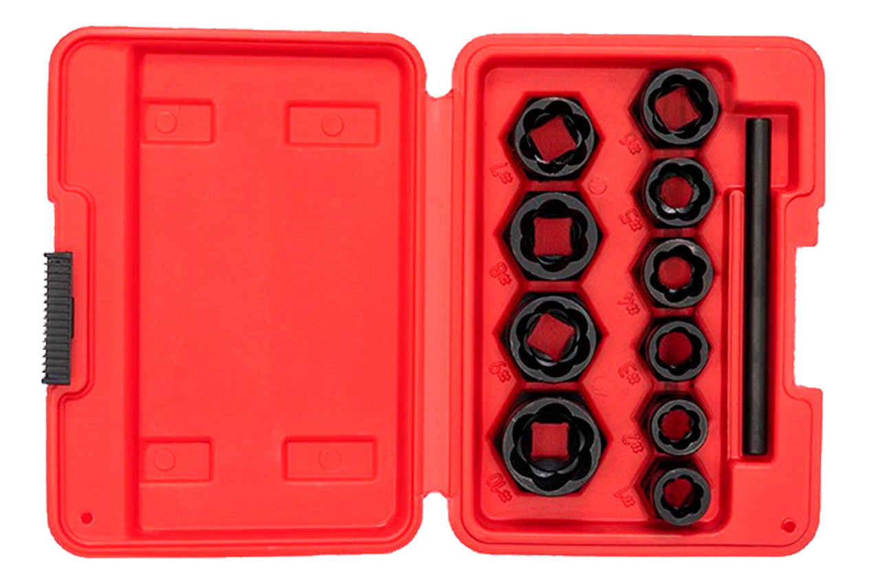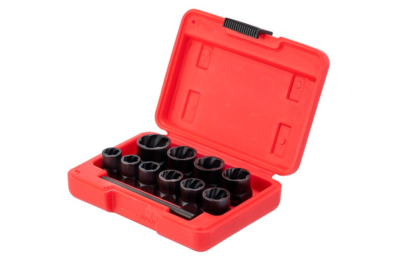 Набор удлиненных экстракторов для поврежденных болтов и гаек SD-8008 необходим для демонтажа болтов и гаек, поврежденных или стертых граней. Набор содержит 10 экстракторов диаметром 9, 10, 11, 12, 13, 14, 15, 16, 17, 19 мм и выколотку для вытягивания застрявших креплений. Все элементы набора изготовлены из хрома молибденовой стали, которая гарантирует высокую прочность и длительный срок службы. Удлиненная форма экстракторов позволяет доставать глубоко посаженные болты и гайки.
