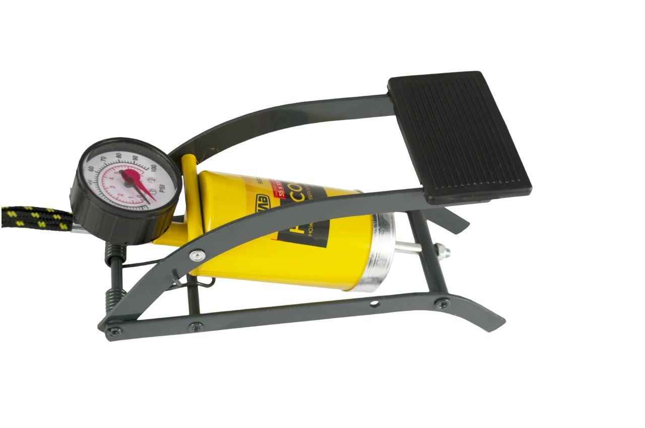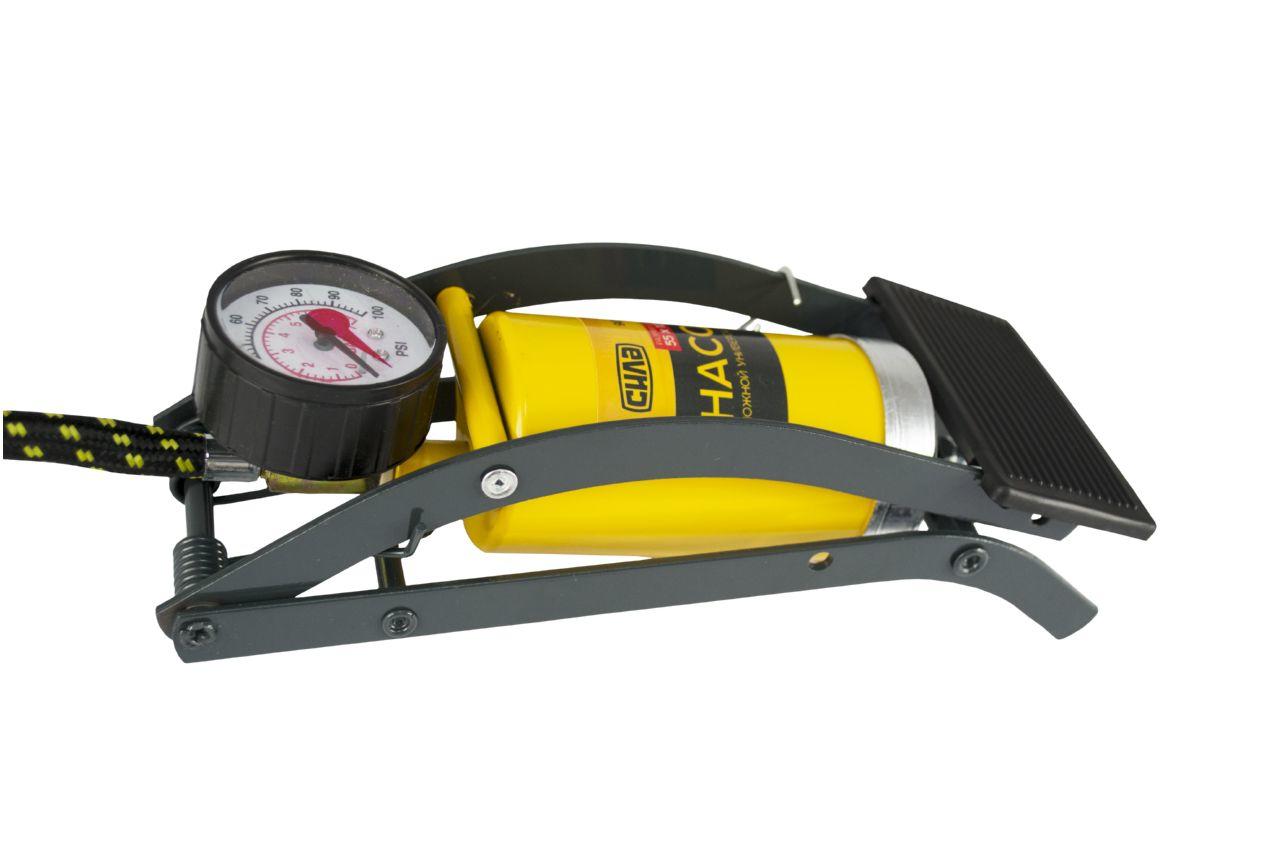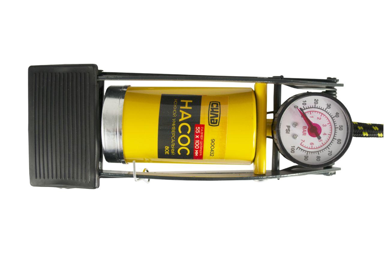 Насос ножной однопоршневой Сила, для быстрого нагнетания воздуха в автомобильные шины, велосипедные колеса или колеса мотоциклов. Манометр - аналоговый; количество цилиндров - 1; размер цилиндра - 55 х 120 мм; максимальное давление - 7 Атм; длина шланга - 55 см. Манометр: аналоговый; Материал цилиндра: металл; Рабочий объем цилиндра: 240см³; Размер цилиндра: 55х100мм; Тип насоса: ножной