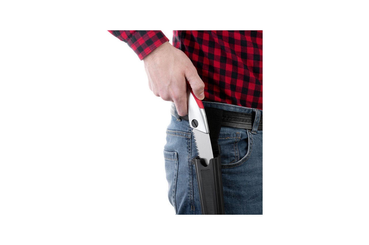 Благодаря компактным размерам (общая длина ножовки 360 мм) и наличию в комплекте пластикового чехла с держателем на пояс ее удобно брать с собой в походы, на рыбалку или для отдыха у костра! Материал лезвия: Сталь SK5; Количество зубьев на дюйм: 8; Длина лезвия: 210 мм; Общая длина: 360 мм; Применение: По дереву