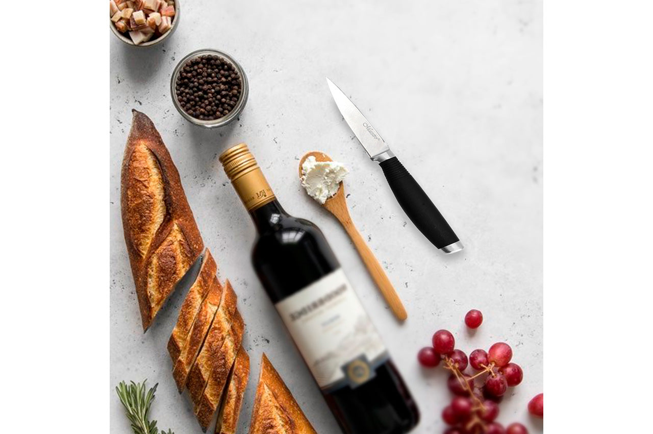 Maestro — это универсальный кухонный нож, лезвие которого изготовлено из высококачественной нержавеющей стали, которая отличается прочностью и долговечностью, не подвержена коррозии и воздействию кислот, соответствует всем гигиеничным нормам и требованиям, не влияет на вкус и проста в уходе.