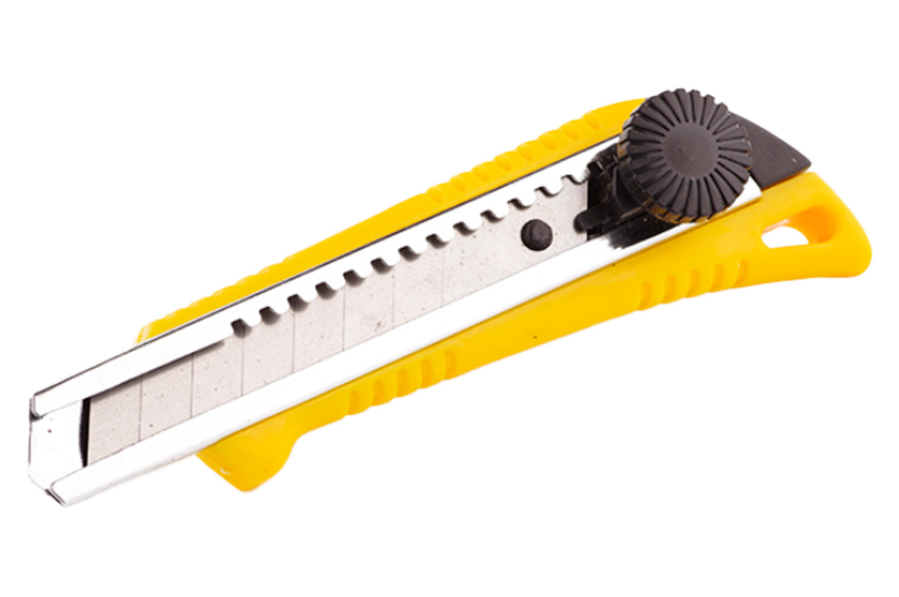 Нож выдвижной из металлической направляющей. Материал корпуса – пластик. Предназначена для разрезания бумаги, картона и других материалов с применением значительных усилий. Имеет эргономичный пластиковый корпус, металлическую направляющую, механизм автоматической фиксации сегментированного сменного лезвия шириной 18 мм.