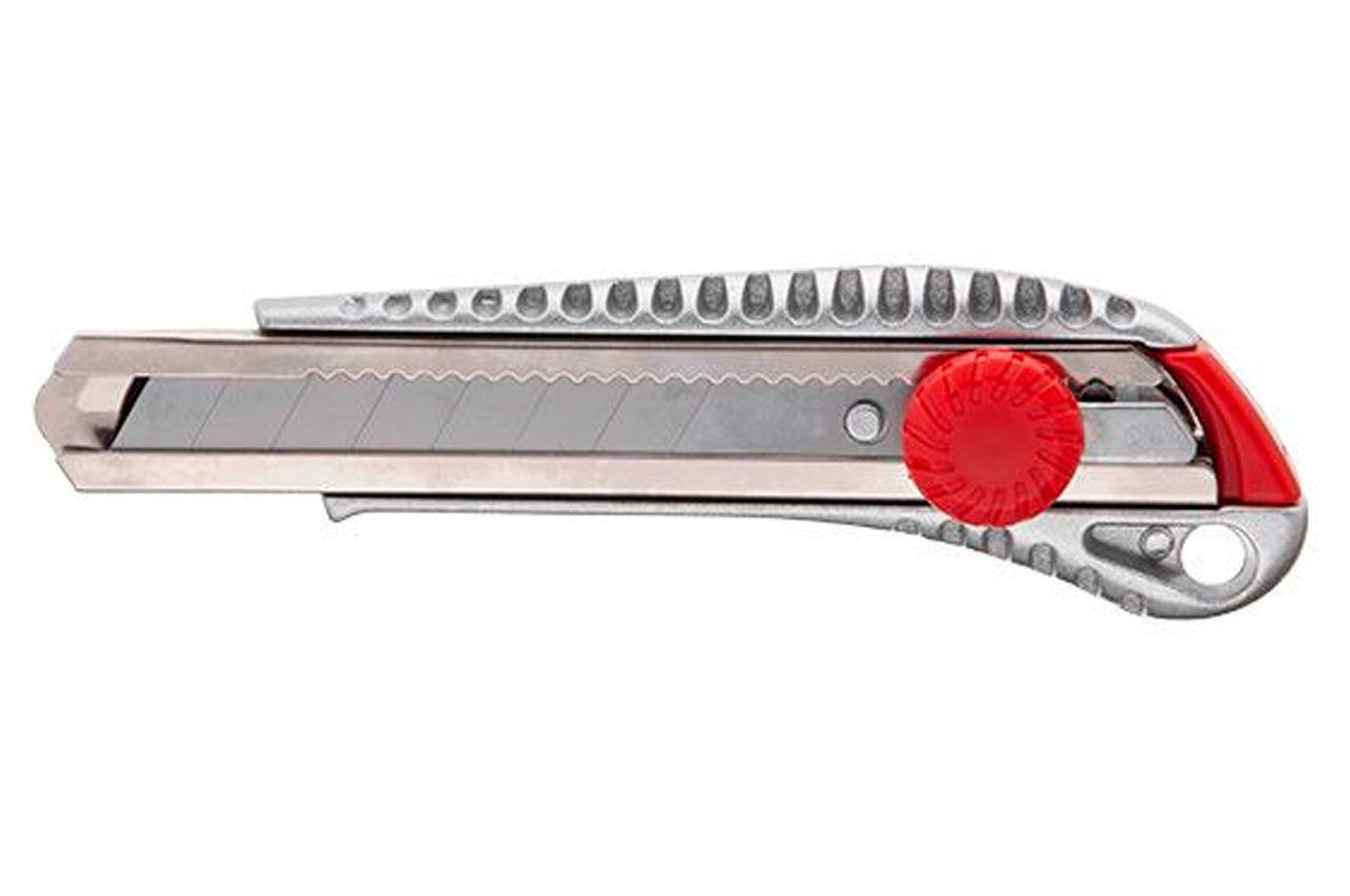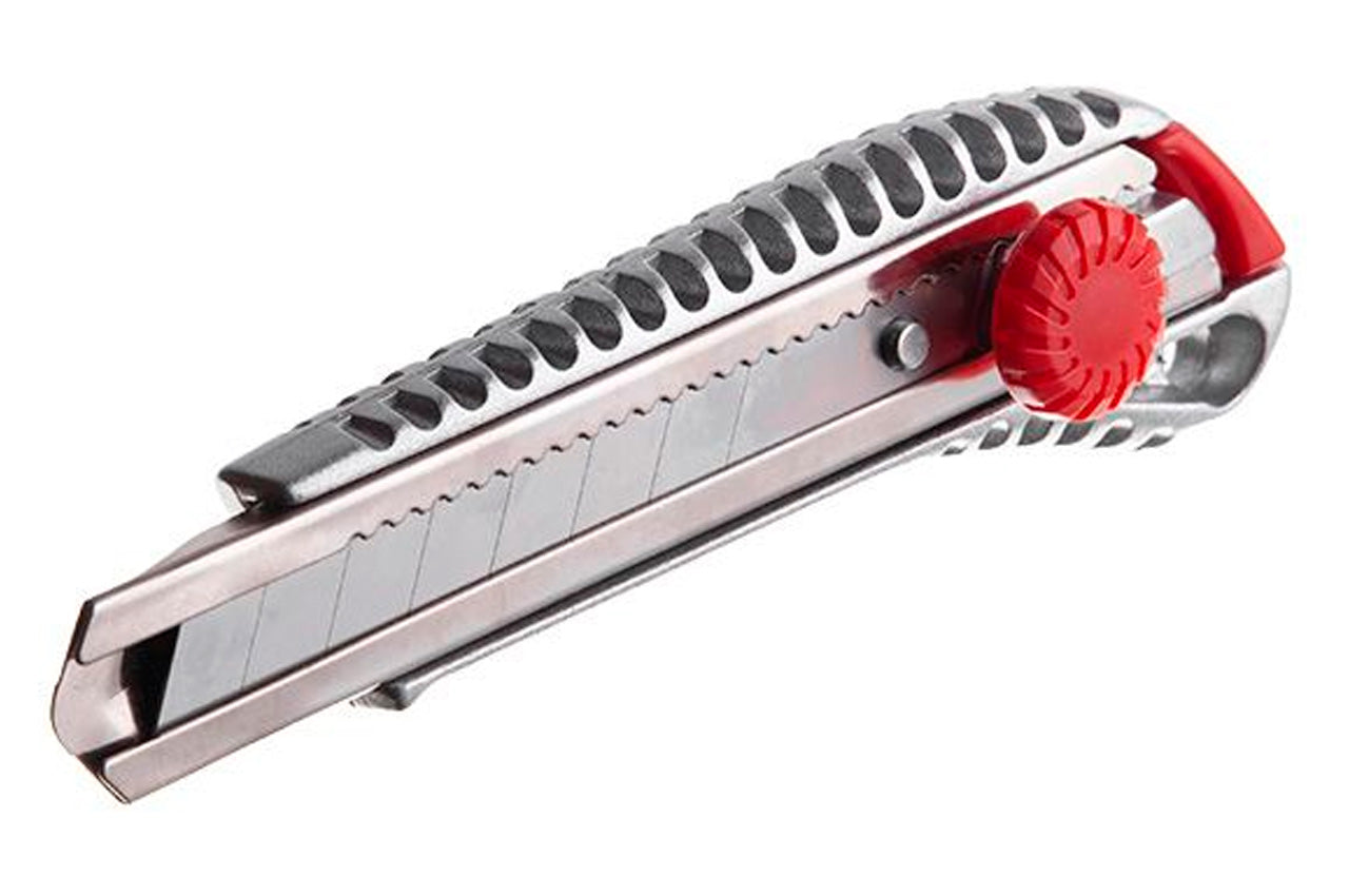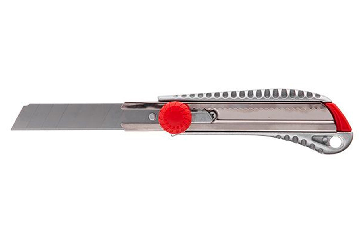 Нож с ломающимся лезвием, с металлической направляющей, противоскользящий корпус, с винтовой фиксацией лезвия. Тип применяемого лезвия: отломное; Материал корпуса: металл; Ширина лезвия: 18 мм; Фиксатор: винтовой