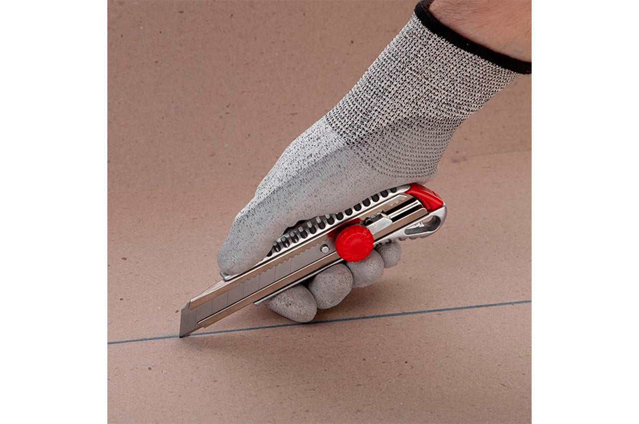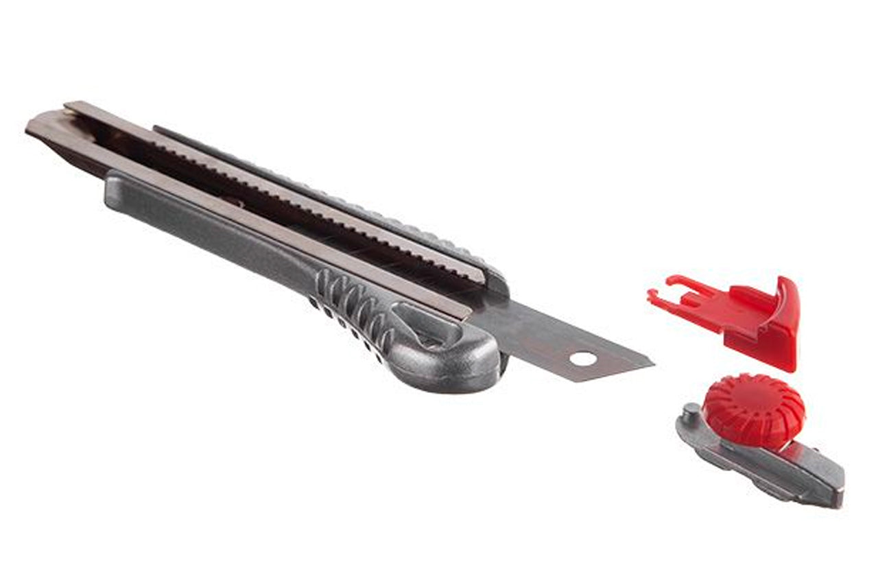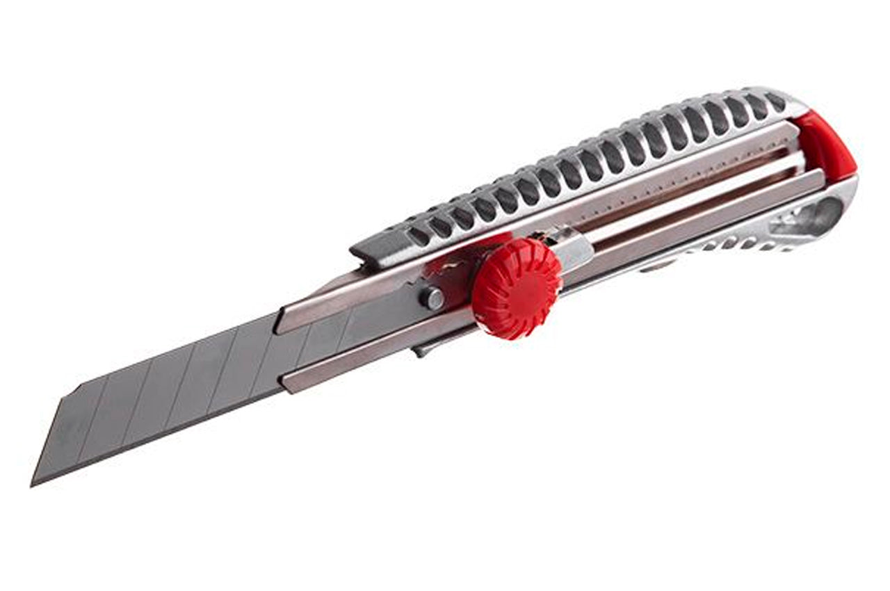 Нож с ломающимся лезвием, с металлической направляющей, противоскользящий корпус, с винтовой фиксацией лезвия. Тип применяемого лезвия: отломное; Материал корпуса: металл; Ширина лезвия: 18 мм; Фиксатор: винтовой