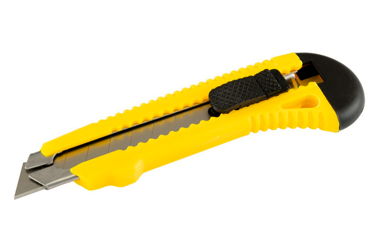 Имеет пластмассовый корпус упрочненной конструкции, металлическую направляющую, кнопки выдвижения и фиксации сегментированного сменного лезвия шириной 18 мм, замена которого осуществляется вручную через хвостовую часть ножа.