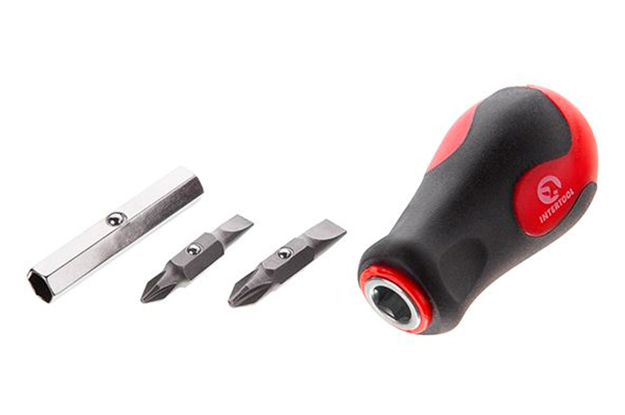 Отвертка со съемными двусторонними битами SL5/SL6 и PH1/PH2.