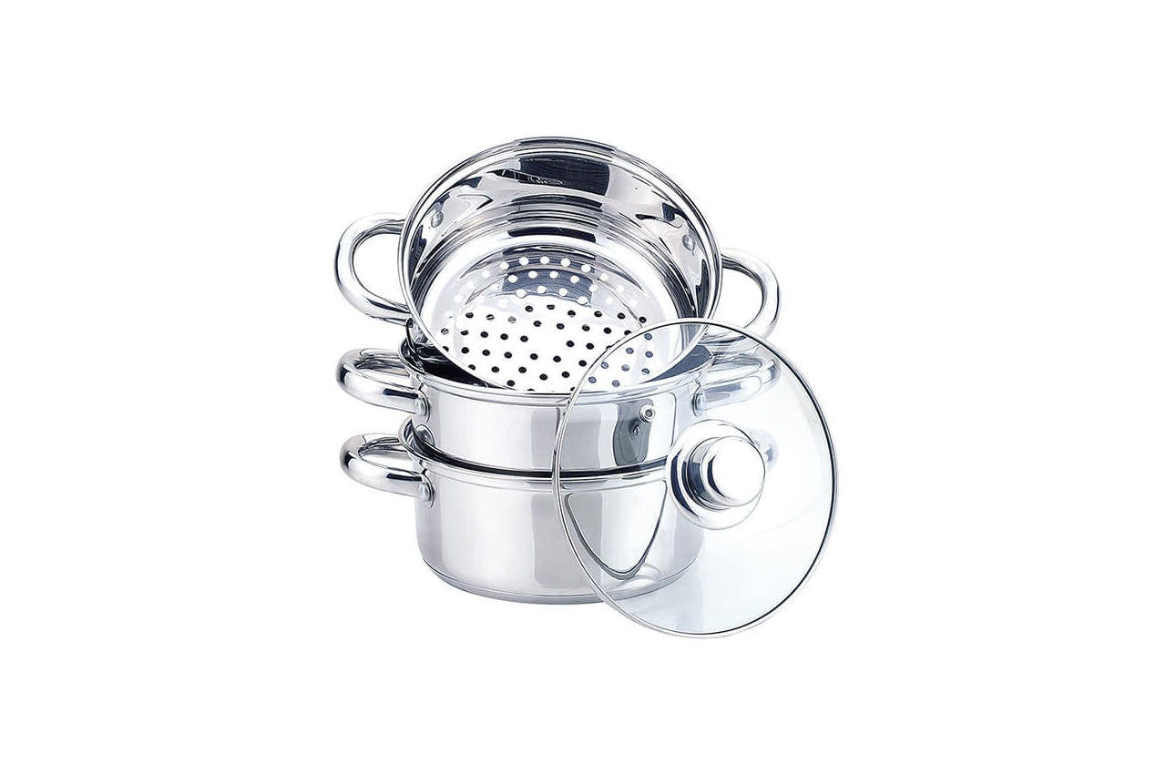 Пароварка трехуровневая. Изготовлена из нержавеющей стали высокого качества. Многослойное дно. Крышка стеклянная с пароотводом.