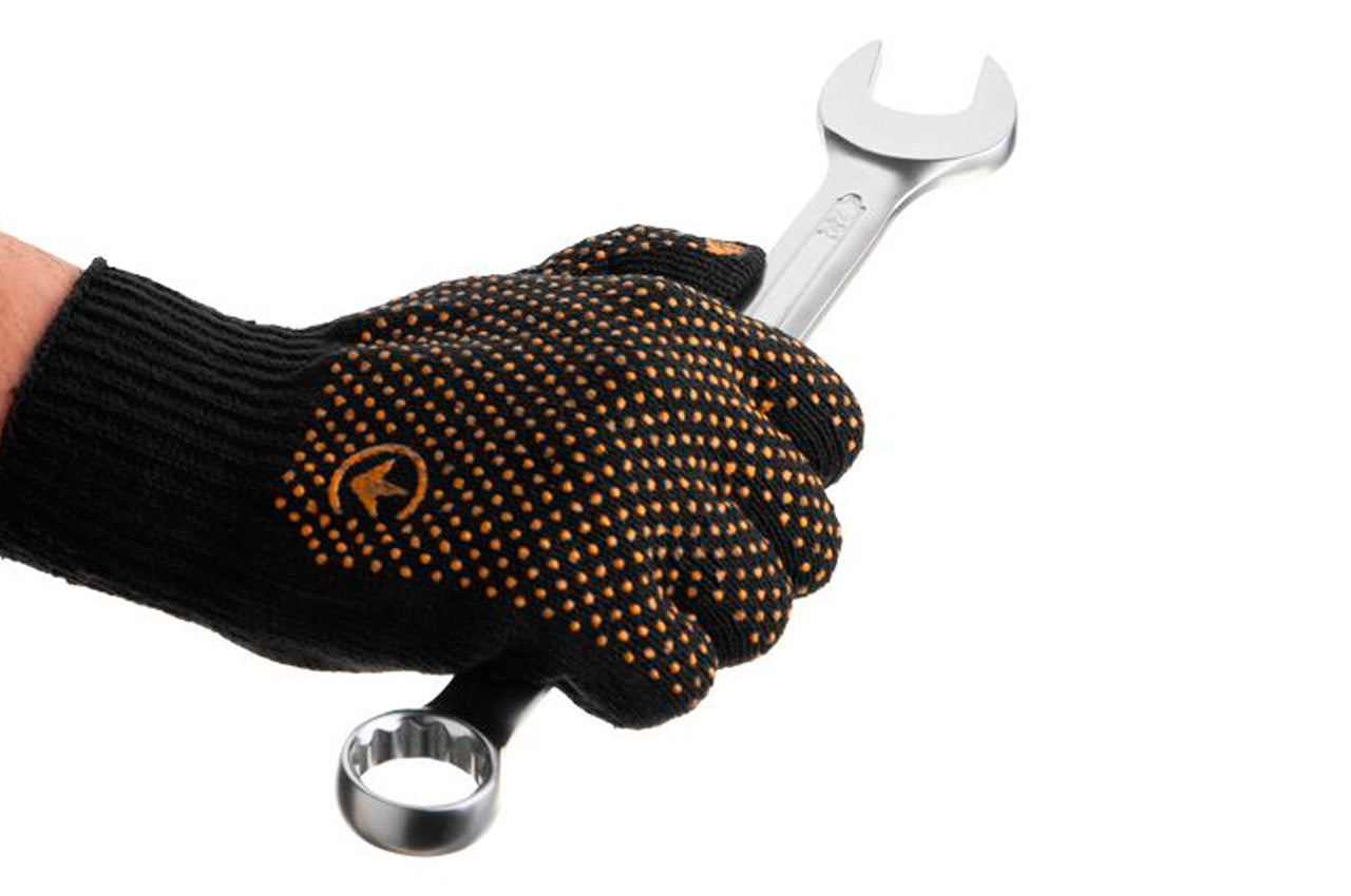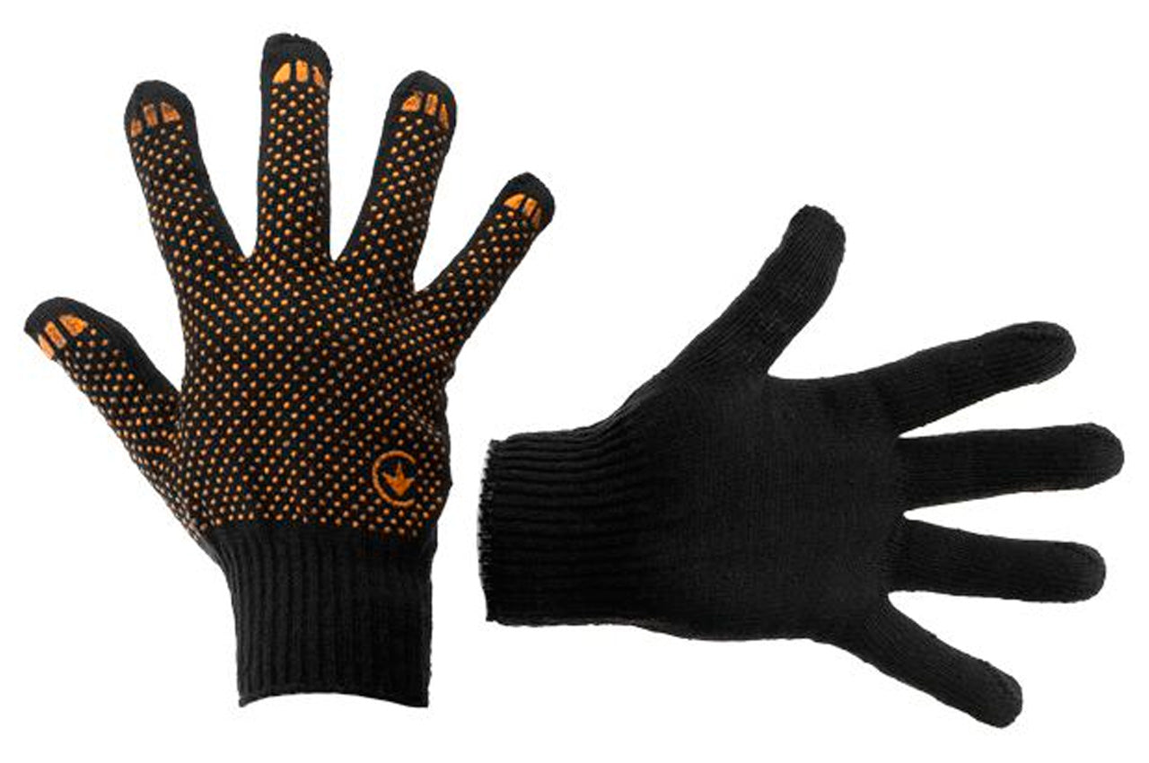 Перчатки хлопчатобумажные SP-0138 черного цвета. На ладони нанесено ПВХ-покрытие, обеспечивающее защиту рук и надежный захват предметов. С эластичными манжетами, мягко прилегающими к кисти и предотвращающими попадание бытового и строительного мусора внутрь перчаток. Благодаря х/б основе обеспечивается свободный воздухообмен. Предназначено для выполнения строительных и сельскохозяйственных работ, ручных механосборных работ. Размер: 10"; Манжет: вязаный с окантовкой; Покрытие: ПВХ точки на ладони