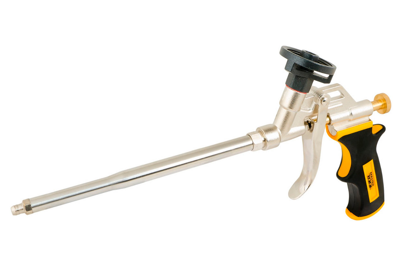 Предназначен для проведения работ с профессиональной монтажной пеной при установке окон, дверей, различных строительных конструкций. Подача пены регулируется расположенным над рукояткой пистолета винтом (его вращение по часовой стрелке уменьшает ход штока, сокращая количество подаваемой пены, и наоборот). Пистолет для монтажной пены 290 мм, тефлоновое покрытие баллоноприемника, иглы