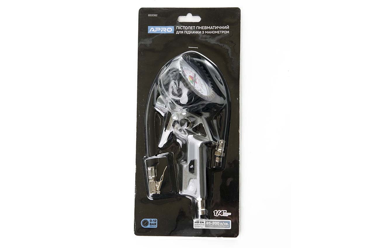 Пистолет пневматический для подкачки колес Apro – используется для подачи и спуска воздуха, а также для определения давления в шинах. Рабочее давление: до 12 атм