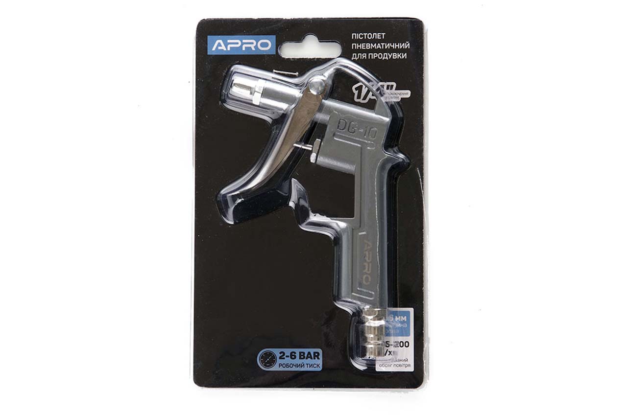 Пистолет пневматический для продувки Apro - используется для очистки поверхностей от пыли. Область применения: автосервисы, гаражи, станции технического обслуживания автомобилей. Пневматическое соединение 1/4"; Рабочее давление 4-6 Бар; Расход воздуха 200 л/мин