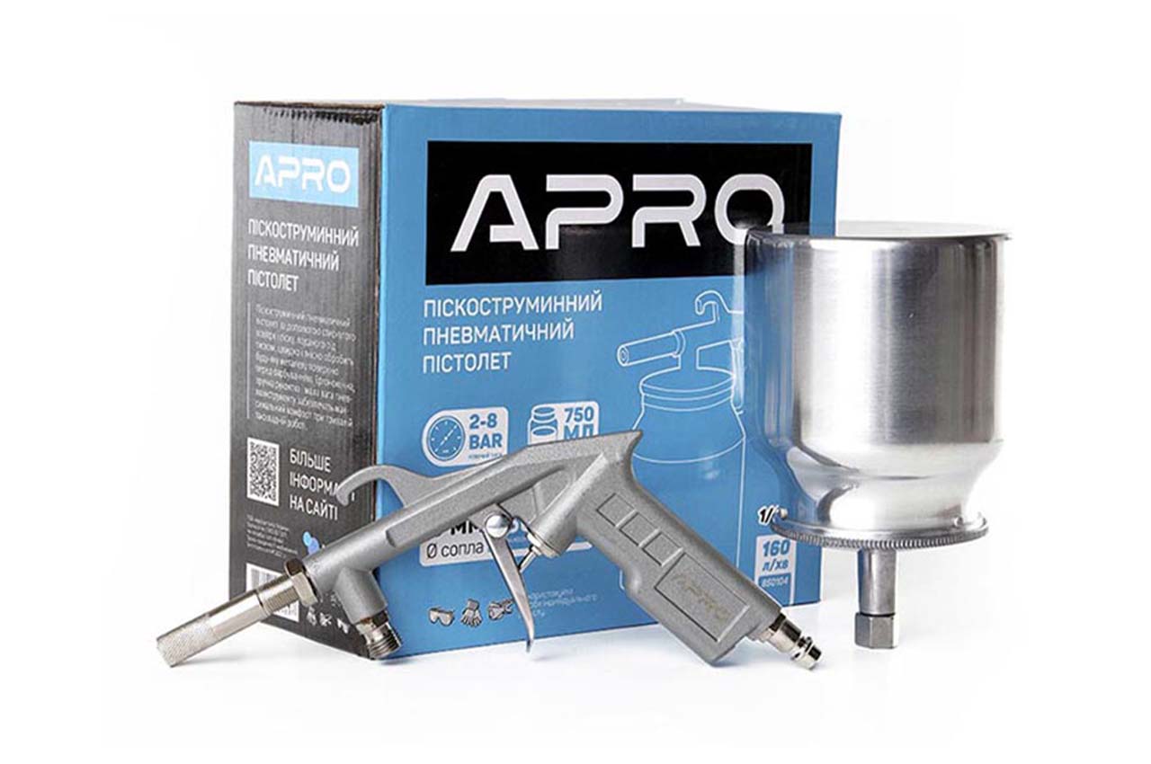 Пистолет пневматический пескоструйный Apro - применяется для очистки различных поверхностей. Объем бака 750 мл; Диаметр сопла 6 мм; Максимальный расход воздуха 160 л/мин; Пневматическое соединение 1/4"; Рабочее давление 2-8 Бар