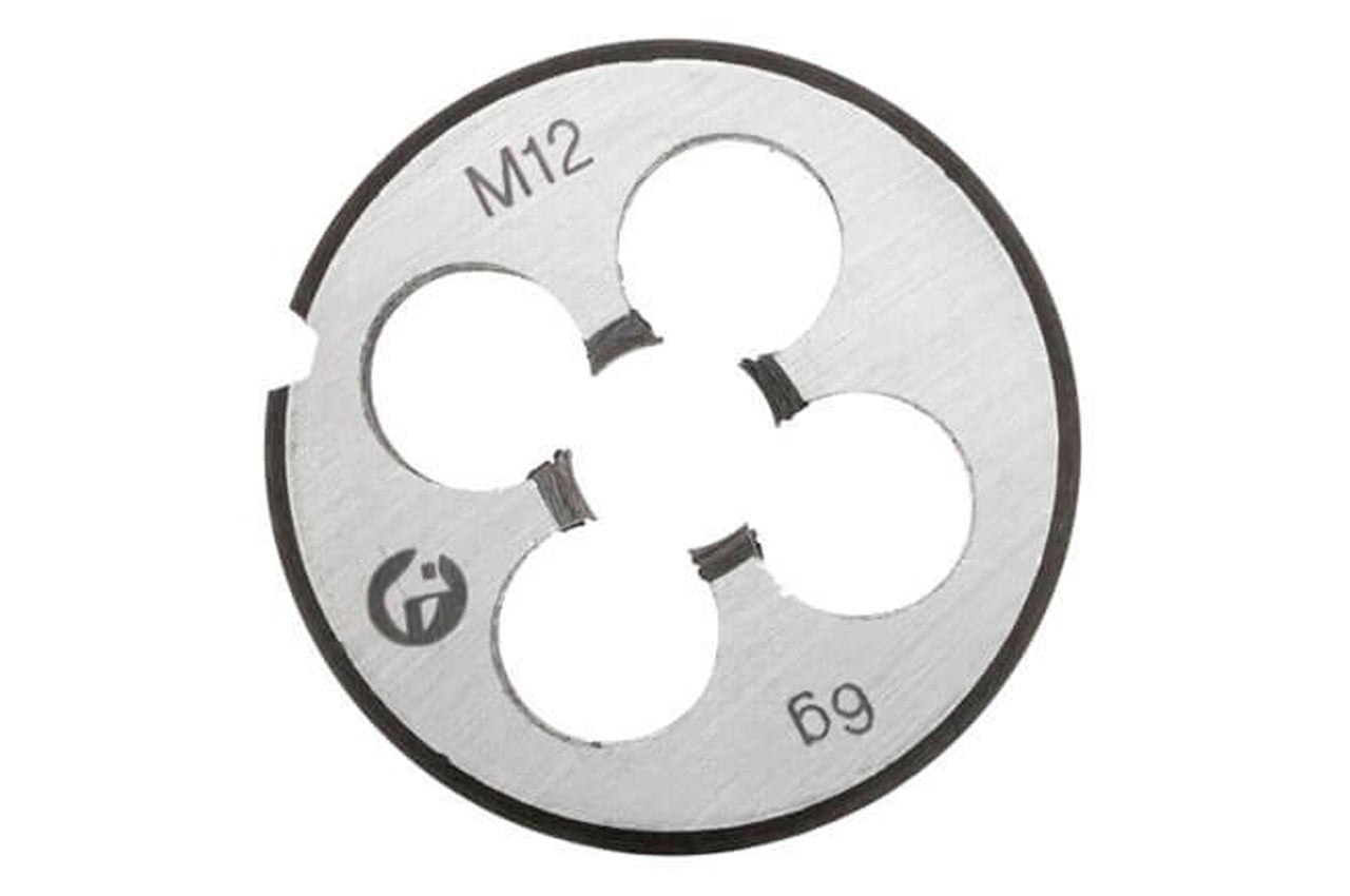 Плашка M12 x 1,75 мм. Резьбонарезной инструмент предназначен для нарезки наружной резьбы вручную или на металлорежущем станке. Размер: М12x1,75 мм