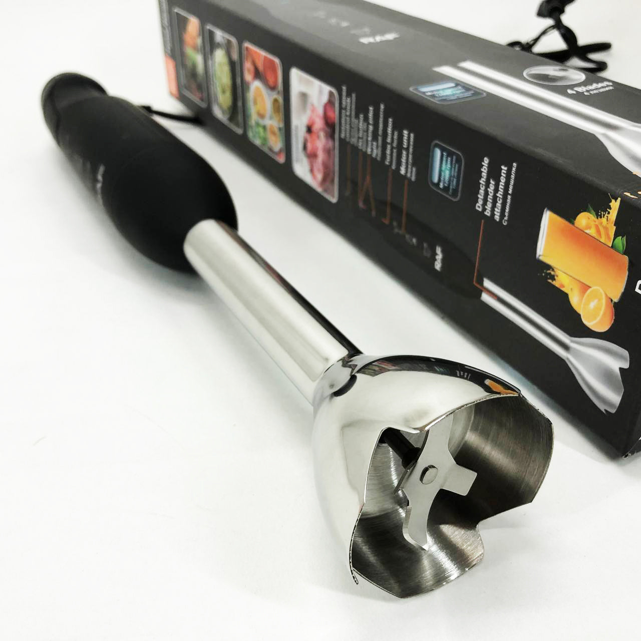 Лезвия из нержавеющей стали гарантируют равномерное смешивание ингредиентов. Блендер удобно лежит в руке благодаря эргономичной конструкции, что делает процесс использования комфортным даже при длительной работе.