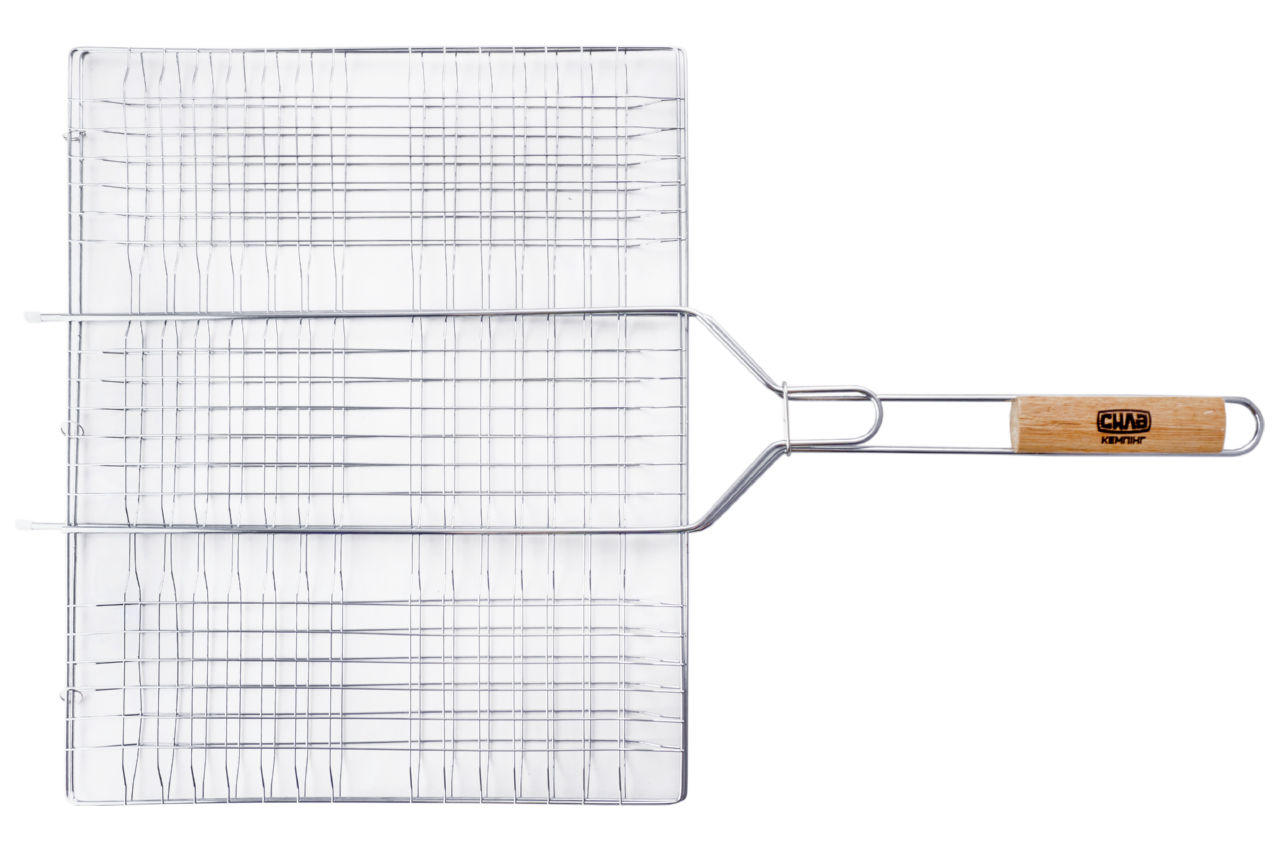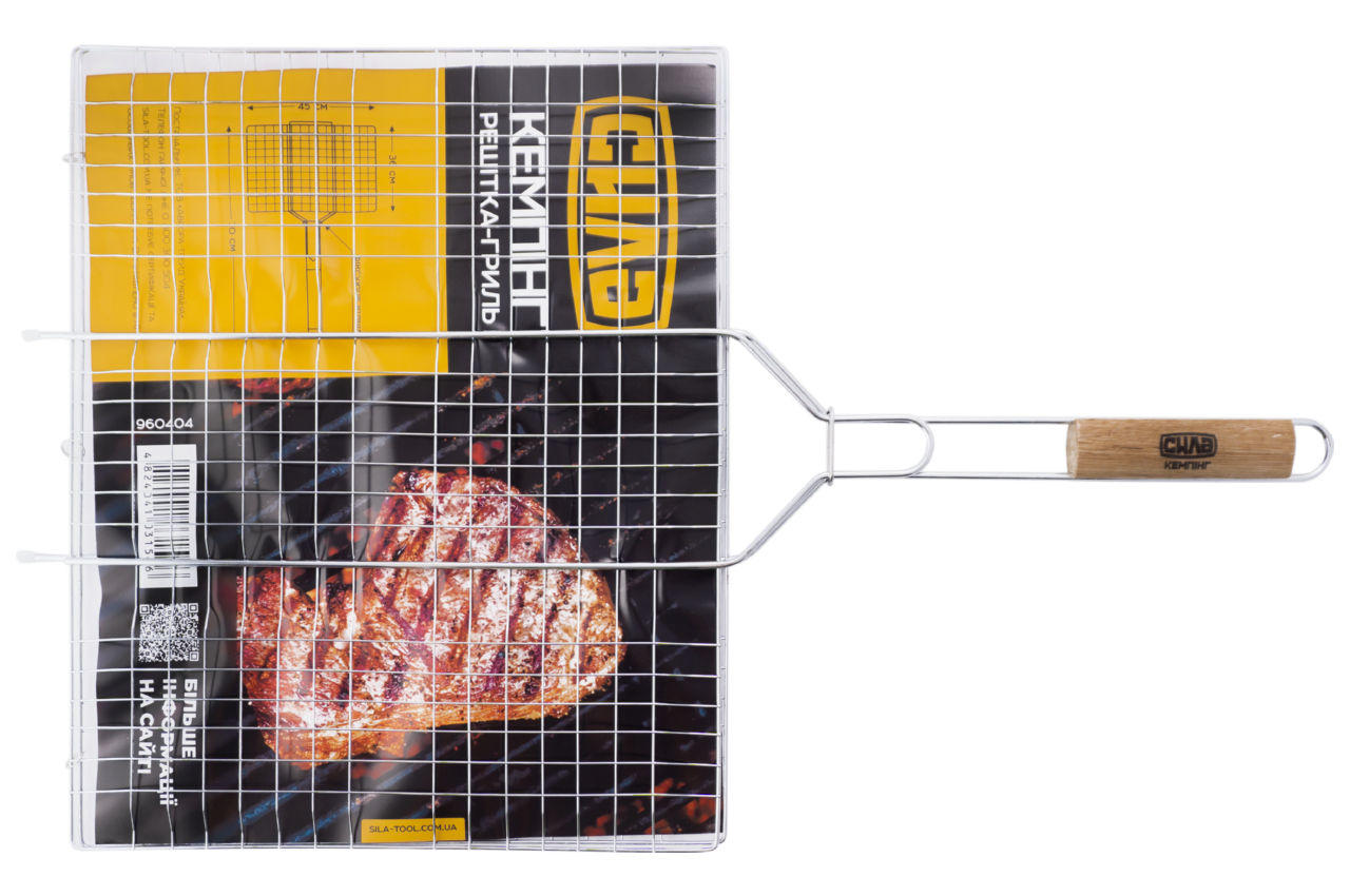 Решетка-гриль Сила - 450 x 360 мм. С ее помощью можно легко и быстро приготовить мясные стейки, рыбу и овощи на открытом огне. Удобная ручка с деревянной вставкой не нагревается. Благодаря надежной фиксации и прижиму продукты прожаривается равномерно, а интересная форма переплетения прутьев придаст очень аппетитный вид готовому блюду.