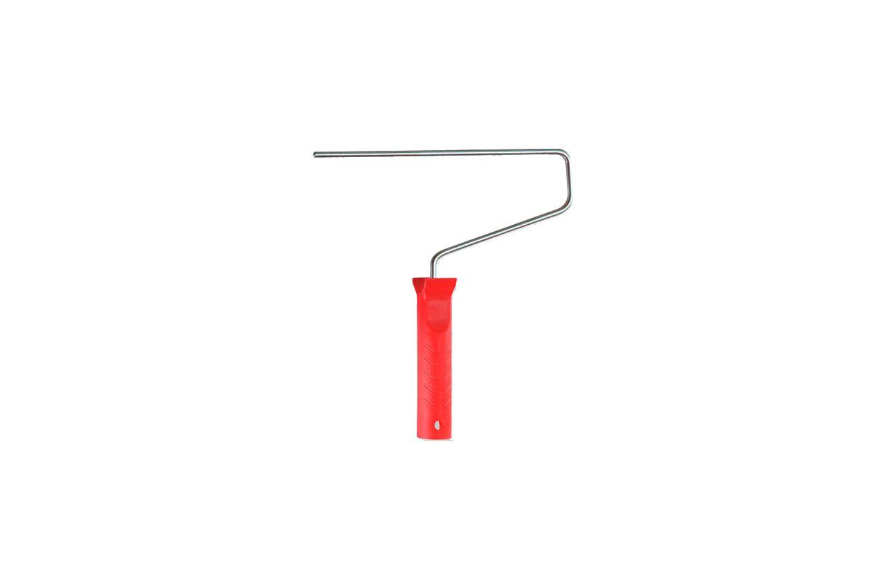 Ручка для валика LT представляет собой деталь, которая состоит из рукоятки и стального изогнутого прутка. Рукоятка изготовлена из красного пластика. Отверстие на рукоятке позволяет хранить инструмент в подвешенном положении на гвоздике. Стальной хромированный прут обладает высокой прочностью, что исключает вероятность его деформации при эксплуатации. Ширина стального прутка для валика составляет 180 мм, а диаметр крепления равен 8 мм.