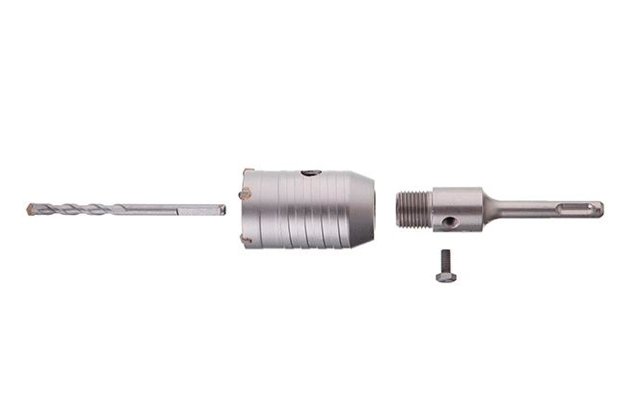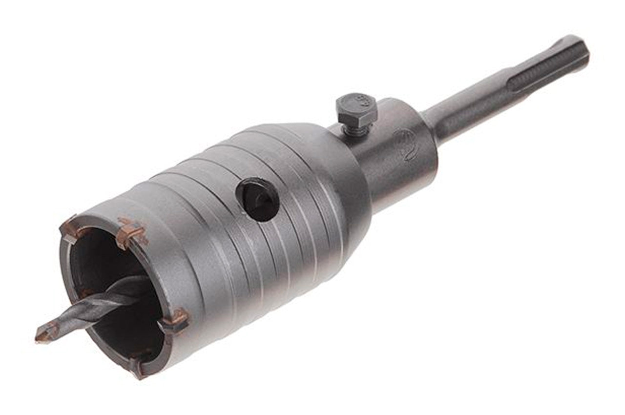 Сверло корончатое (фреза) по бетону "Intertool" с твердосплавными победитовыми напайками, напрвляющим сверлом и хвостовиком SDS+. Материал - сталь 40Cr. Диаметр сверления - 46 мм, длина хвостовика - 100 мм. Применение: для сверления отверстий в прочных абразивных материалах, таких как кирпич, бетон, пенобетон, камень и пр.
