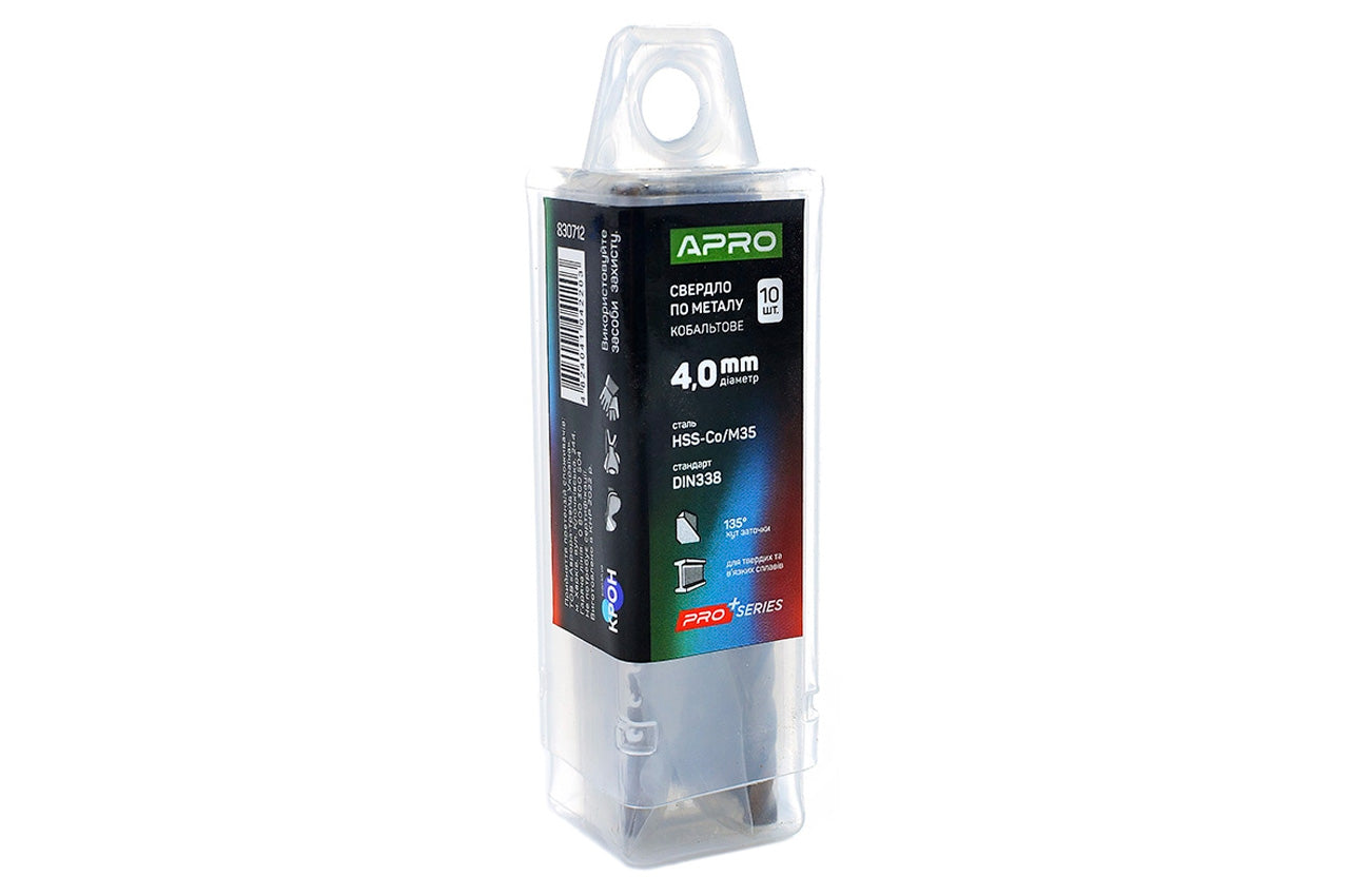 Сверло по металлу Apro – предназначено для сверления отверстий в металлических материалах, включая сталь, чугун, алюминий и другие сплавы. Диаметр сверла 4,0 мм. Тип стали: Кобальт Co/M35.