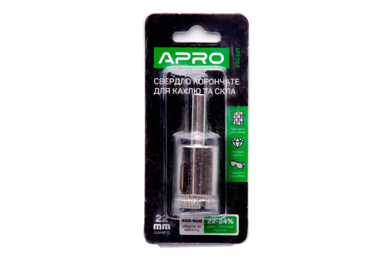 Сверло по стеклу и керамике трубчатое Apro применяются для сверления отверстий в оптическом и техническом стекле, керамической плитке, мраморе, кафеле. Диаметр сверла 22 мм