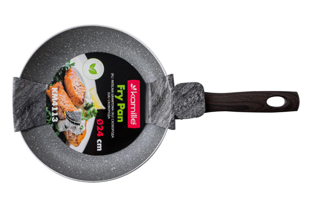 Сковорода антипригарная Kamille – 240 мм Grey Marble 4113 Диаметр 24см, высота стенок 4.5см, длина ручки 17.5см. Изготовлена из кованого алюминия. Универсальная сковорода с высоким уровнем крепости, высокими теплопроводными свойствами, стойкостью к деформации при нагревании до высоких температур. Высококлассное антипригарное покрытие ILAG обеспечивает равномерное распределение тепла и защищает пищу от пригорания. Сковорода с антипригарным покрытием абсолютно безопасна для здоровья и окружающей среды. Легко моется вручную и в посудомоечной машине. Бакелитовая ручка с покрытием "Soft-Touch", стилизованная под дерево, коричневого цвета. Сковорода подходит для индукционных плит.
