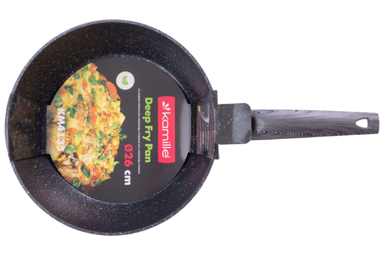 Сковорода антипригарная Kamille – 260 мм Black Marble глубокая. Благодаря прочному гранитному покрытию такая сковорода устойчива к механическим воздействиям, за счет чего значительно увеличивается срок ее службы. Сотейник нагревается равномерно, не создавая перегретые участки и холодные края, даже в тех случаях, когда процесс приготовления пищи идет на небольшом огне. В результате сокращается время приготовления блюда и уменьшается риск есть смесь недожаренной или пережаренной пищи.