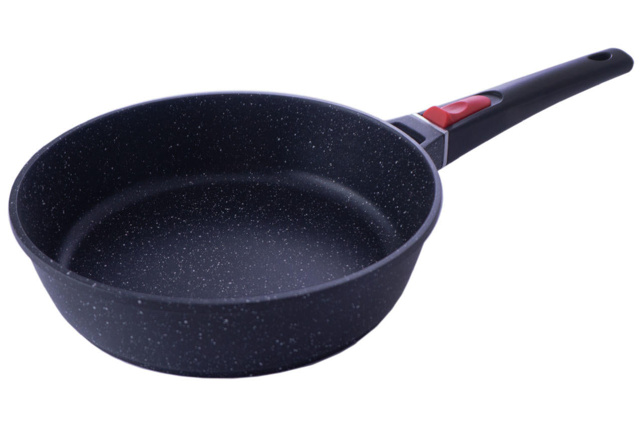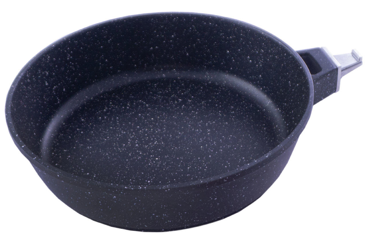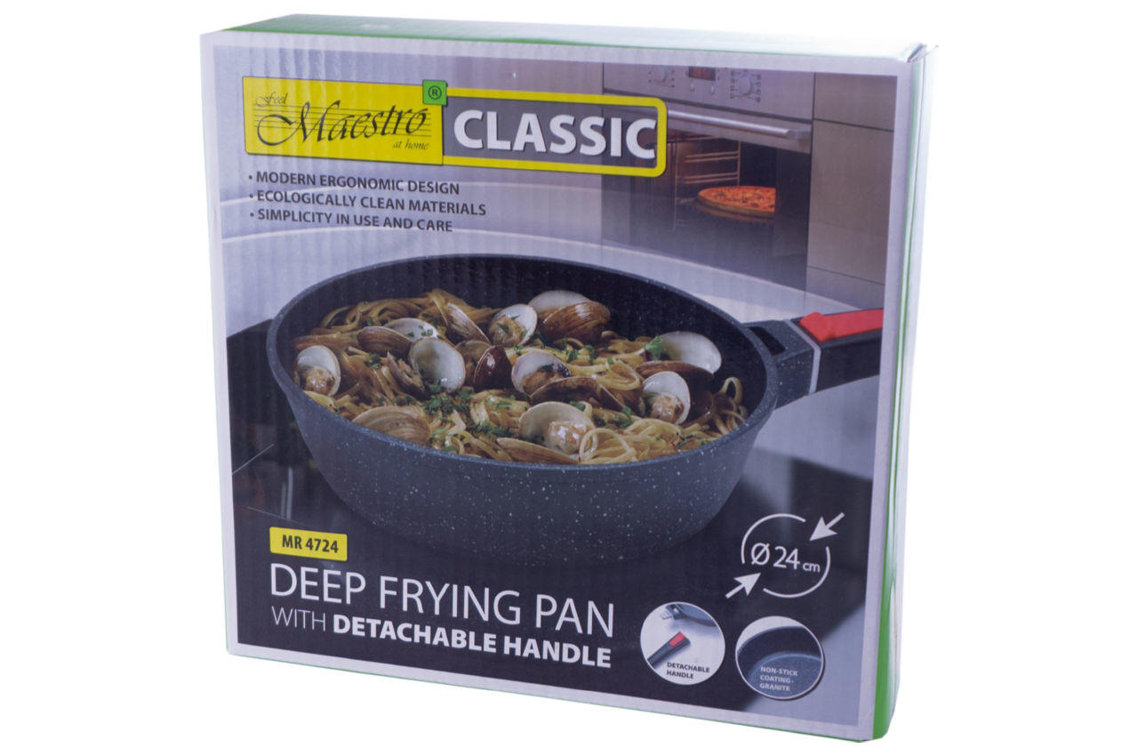 Сковорода антипригарная Maestro MR-4724 диаметром 24 см, высотой 6,5 см, имеет съемную ручку. Модель проста в использовании и уходе, легко моется. Литой алюминиевый корпус покрыт устойчивым к механическому воздействию антипригарным покрытием Granite. Дно имеет стальную антидеформационную вставку позволяющую использовать сотейник с любыми видами плит и варочных поверхностей (газ, электро, индукция и пр.)