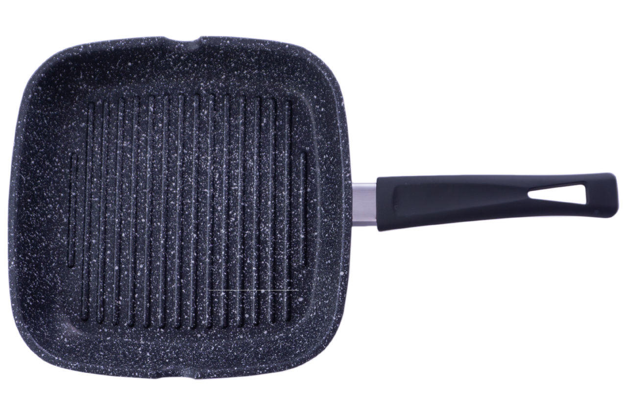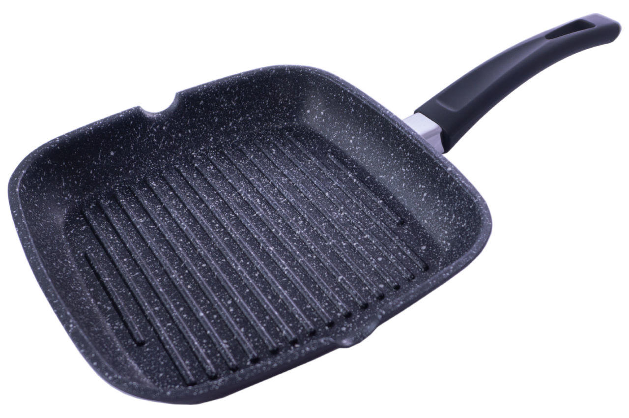 Сковорода гриль квадратной формы 24х24 см, имеет ребристое дно с антипригарным покрытием TEFLON CLASSIC. Толщина стенок - 2,5 мм.