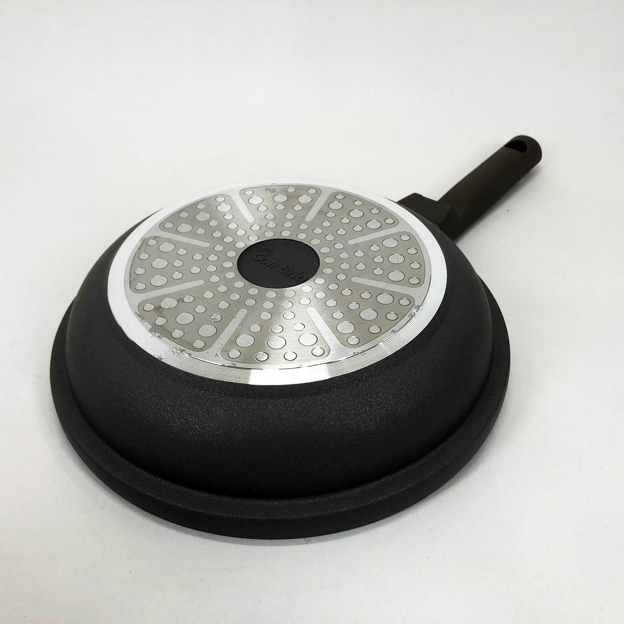 - Утолщённый алюминиевый корпус изготовлен по технологии выжимного литья, что позволяет более равномерно распределять температуру по всей поверхности сковороды.
