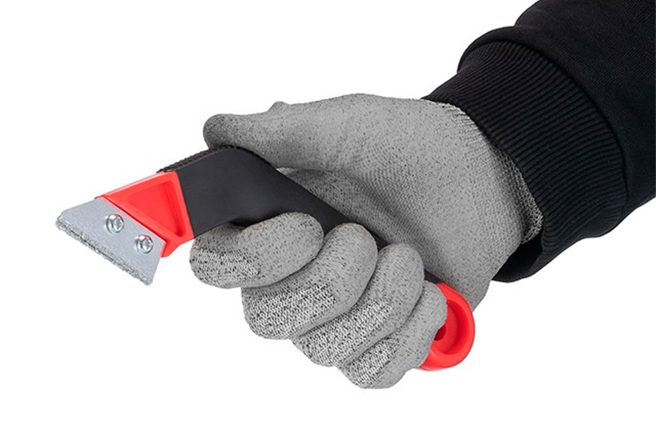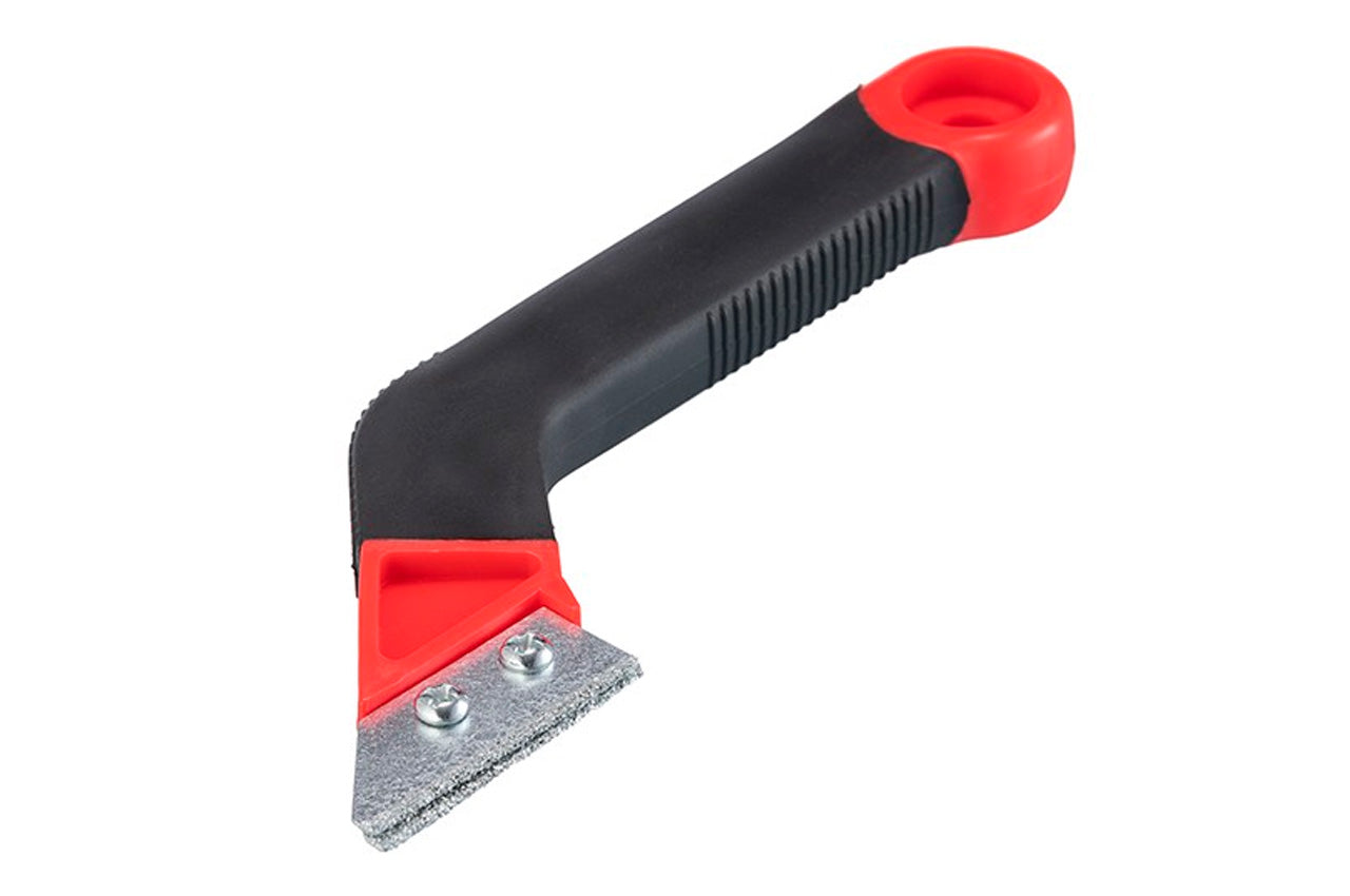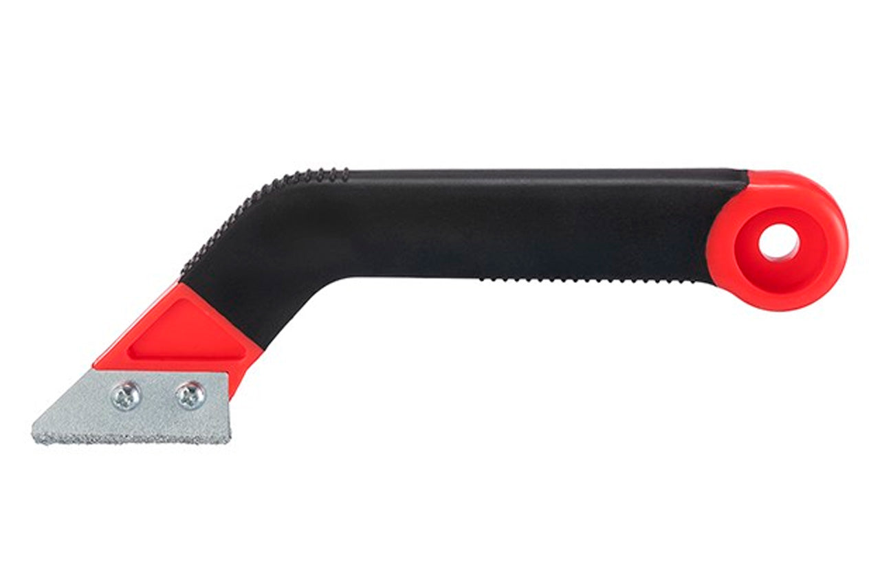 Высокий уровень удобства при работе данным скребком достигается с помощью двухкомпонентной ручки из пластика с прорезиненным покрытием. Ее эргономичная форма гарантирует надежный хват инструмента без скольжений, а небольшой вес помогает работать дольше без усталости в руках. Также на рукоятке предусмотрено отверстие для удобного хранения скребка на стене.