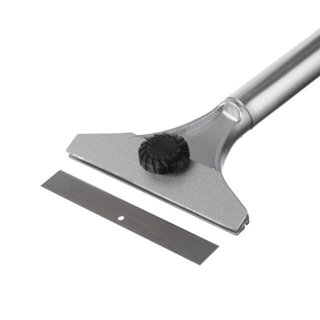 Ручной скребок с фиксированным лезвием используется для очистки любых поверхностей от загрязнений, старых лакокрасочных покрытий, пленок, шпатлевок, штукатурки и других строительных материалов. Небольшая длина 350 мм и угловое крепление лезвия позволяют достать инструментом в труднодоступные места и прикладывать больше усилия двумя руками, что очень удобно в работе. Скребок имеет крепкую стальную конструкцию с фиксированным лезвием, длина 100 мм. Удобная прорезиненная ручка обеспечивает плотное сцепление с ладонью. Скребком удобно работать даже влажными и грязными руками.