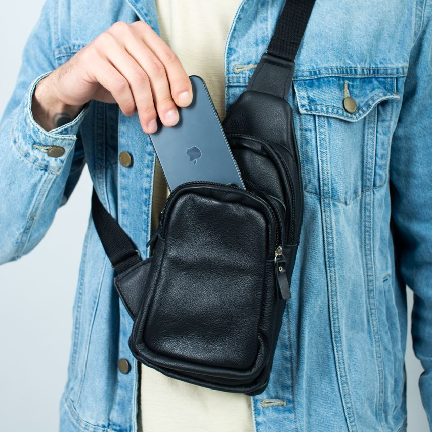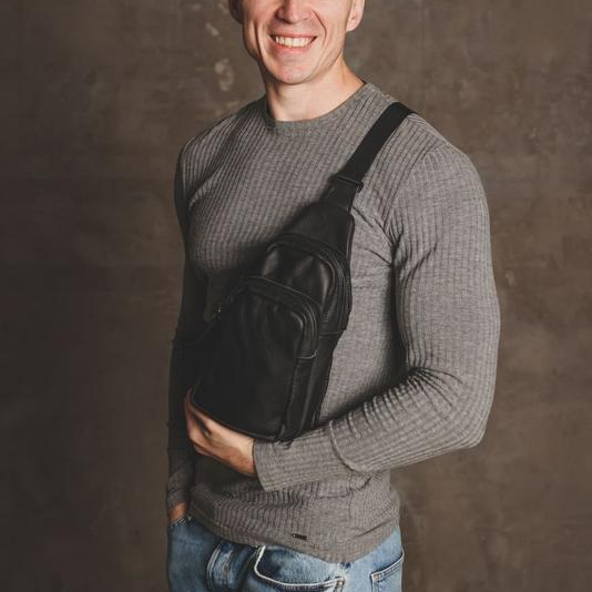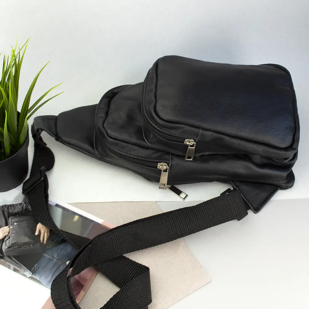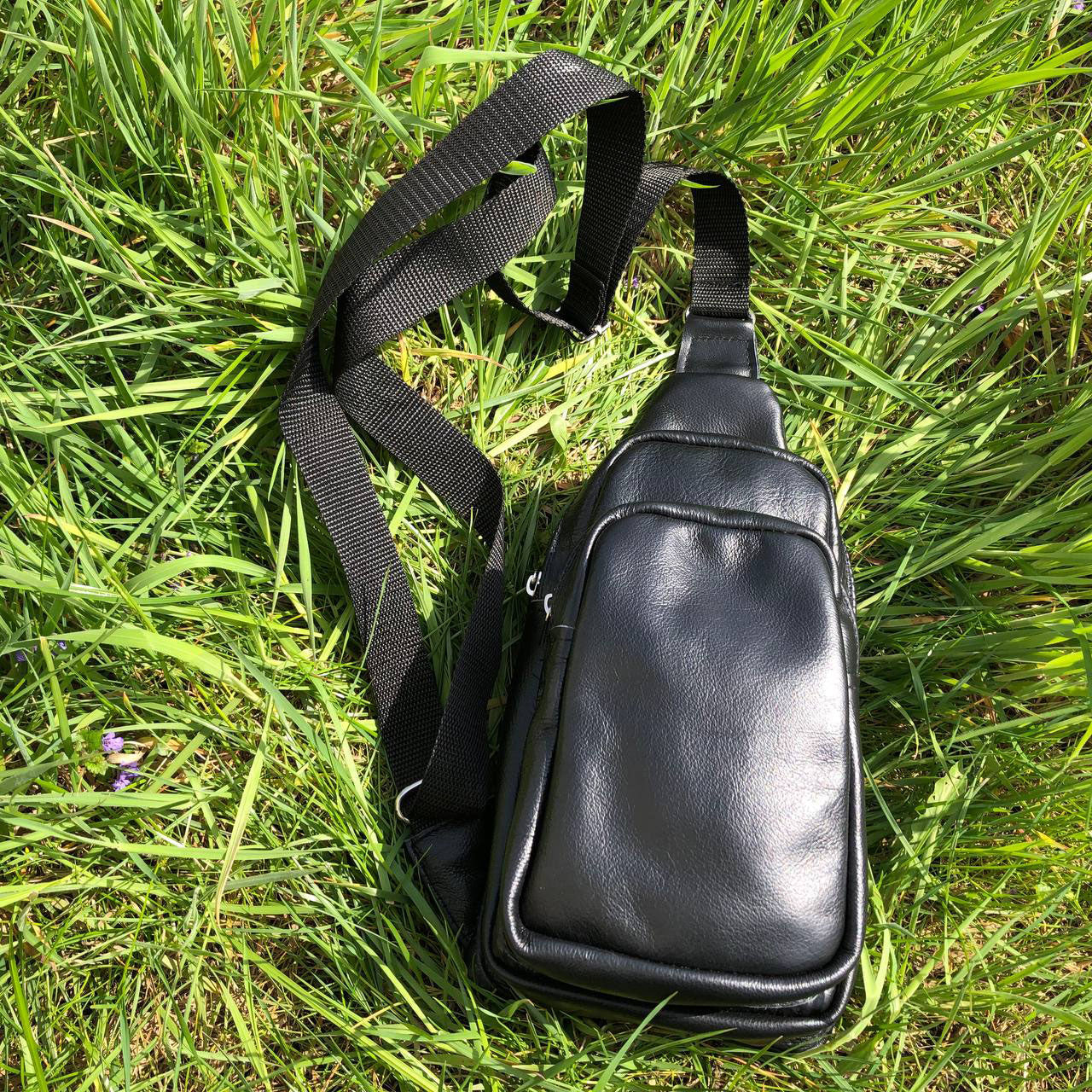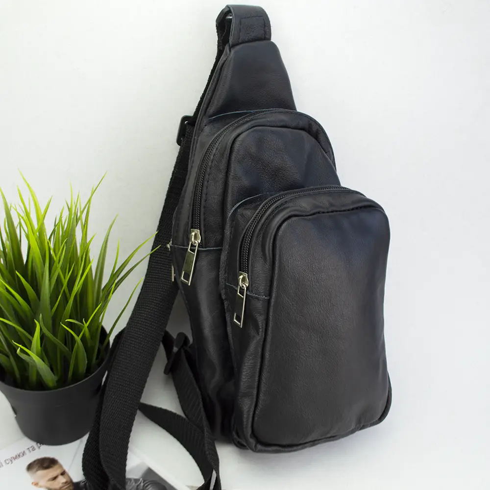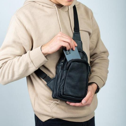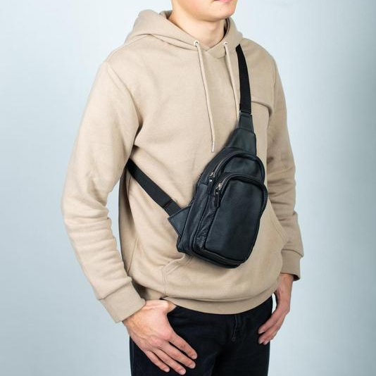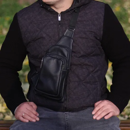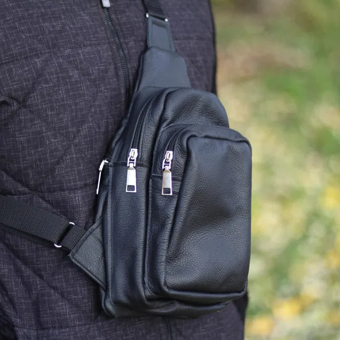 Стильная мужская сумка - бананка, слинг нагрудная из натуральной кожи на молнии чёрная