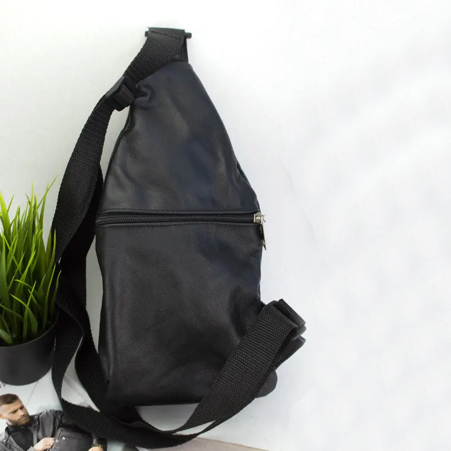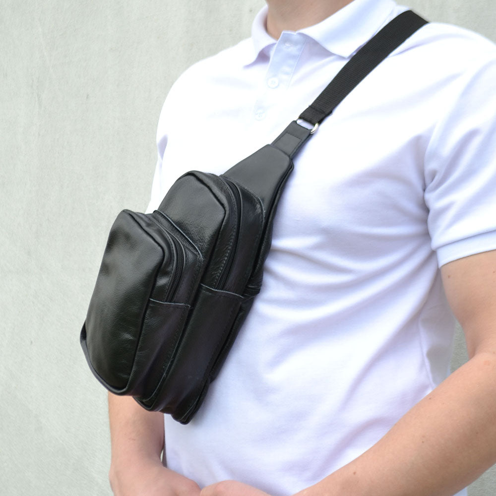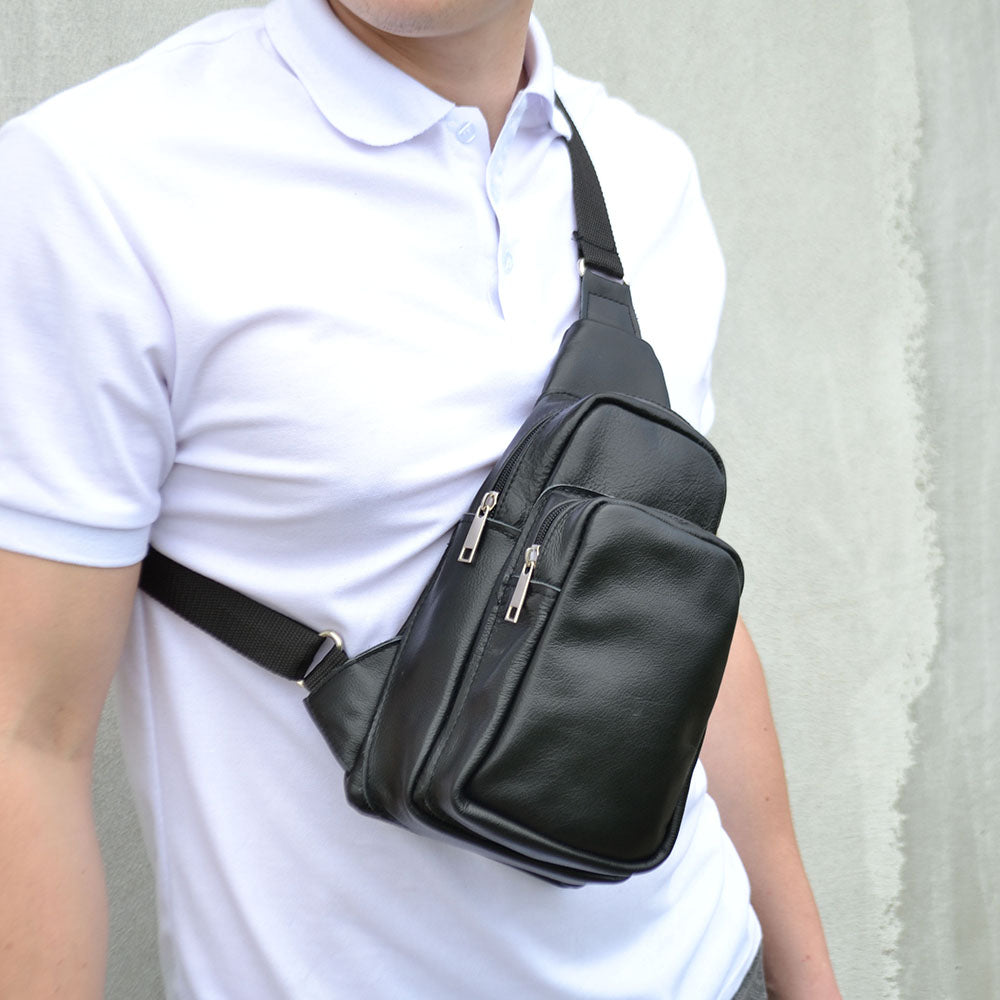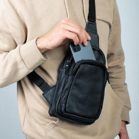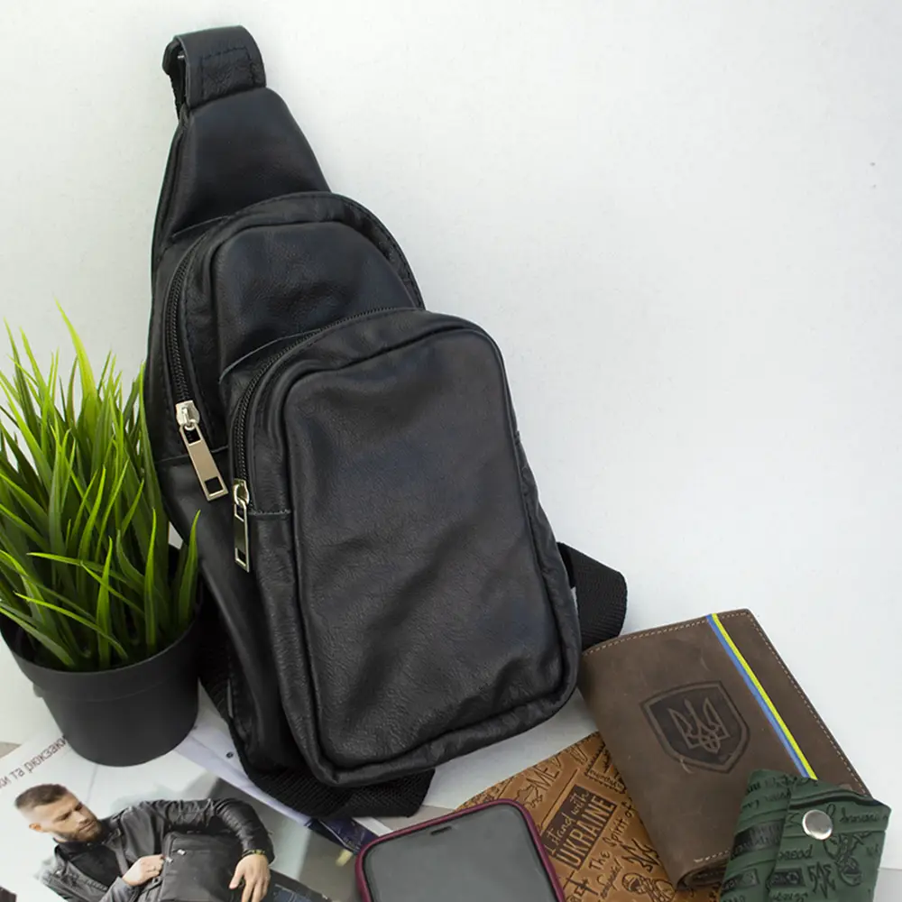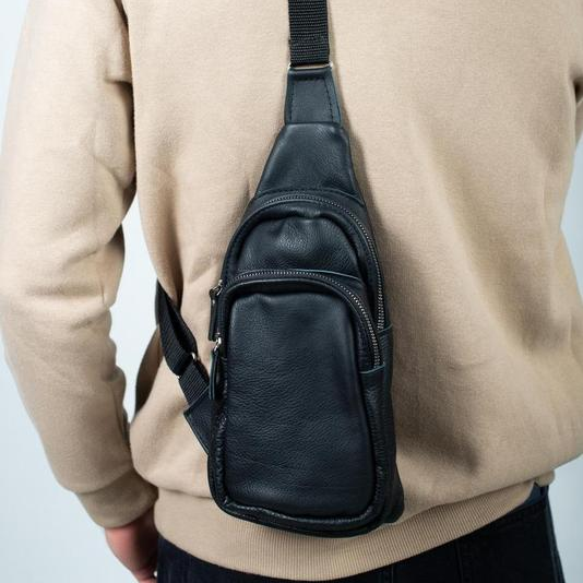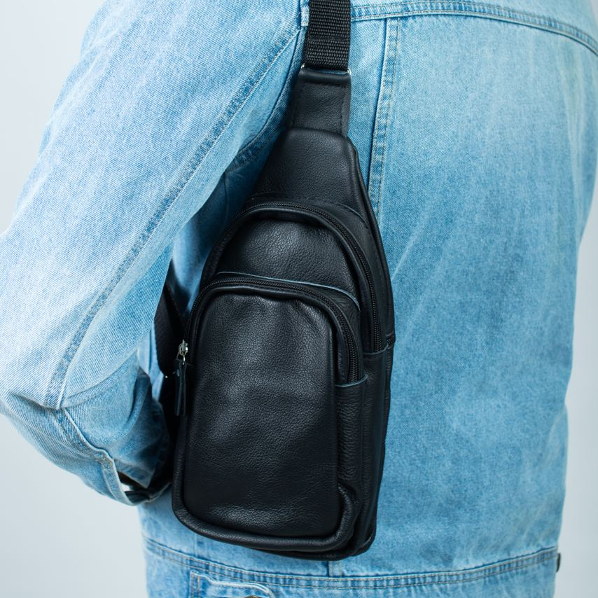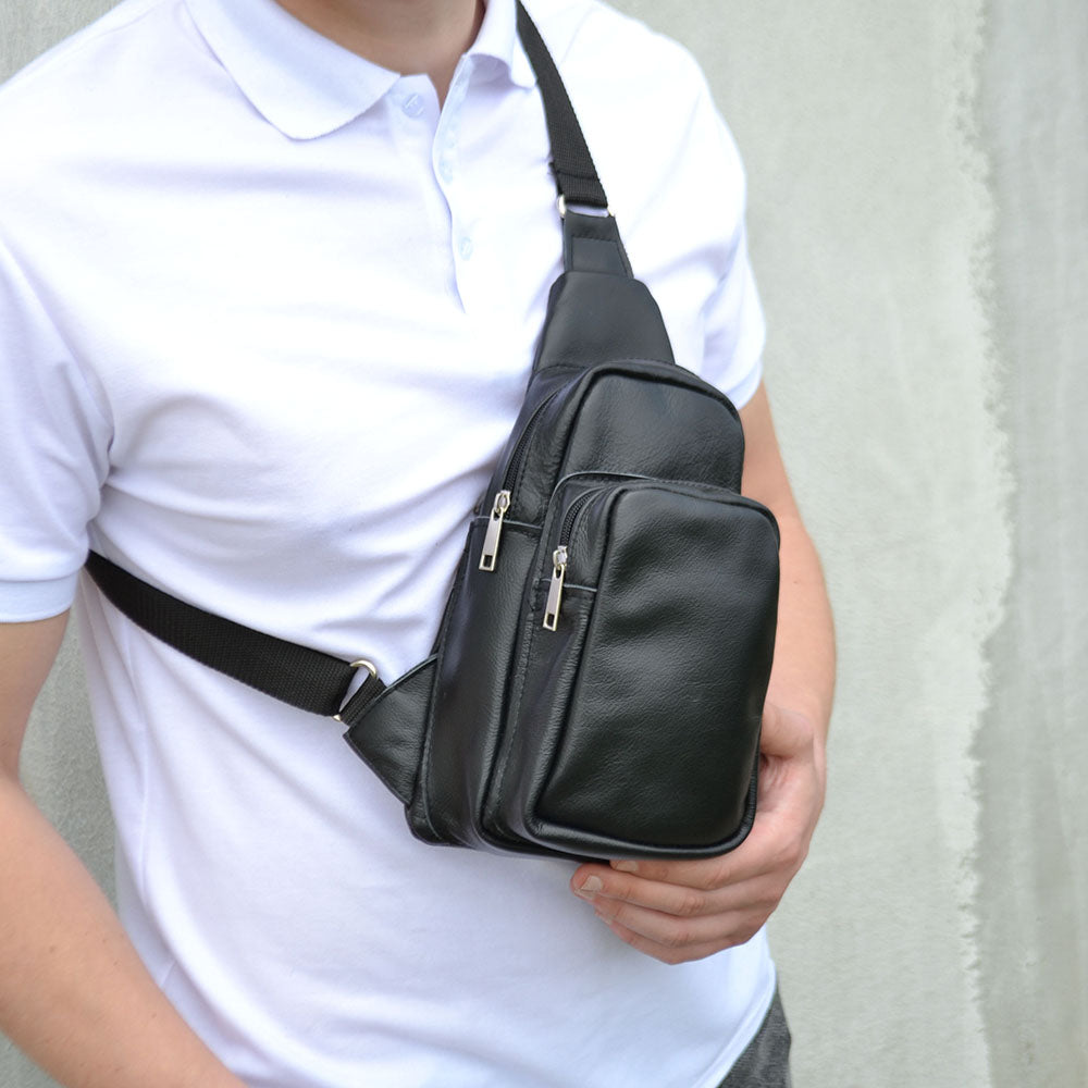 Стильная мужская сумка - бананка, слинг нагрудная из натуральной кожи на молнии чёрная