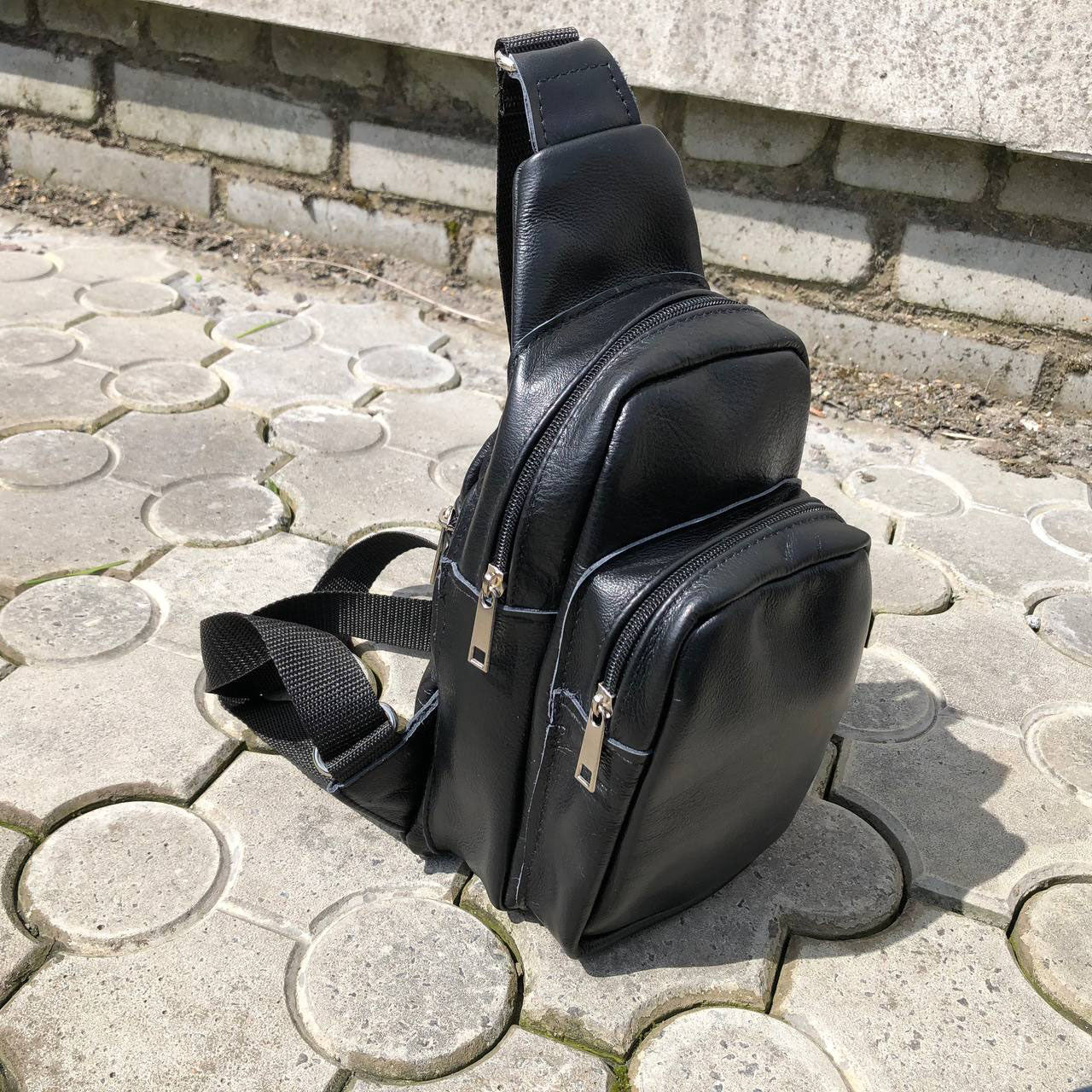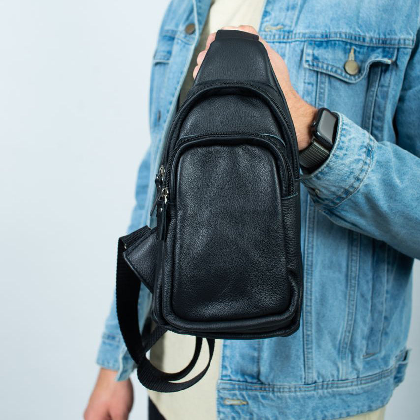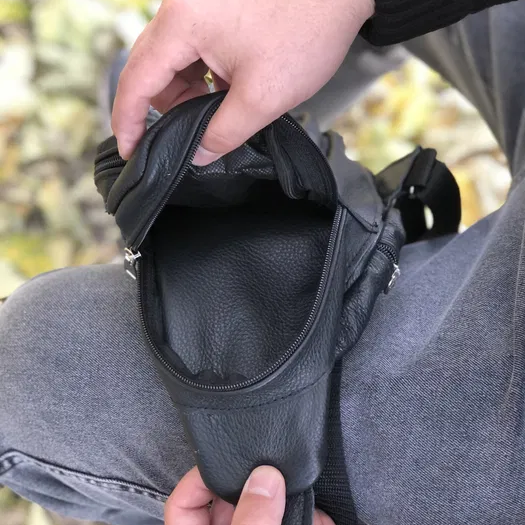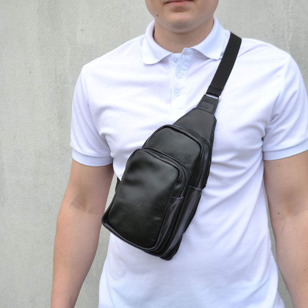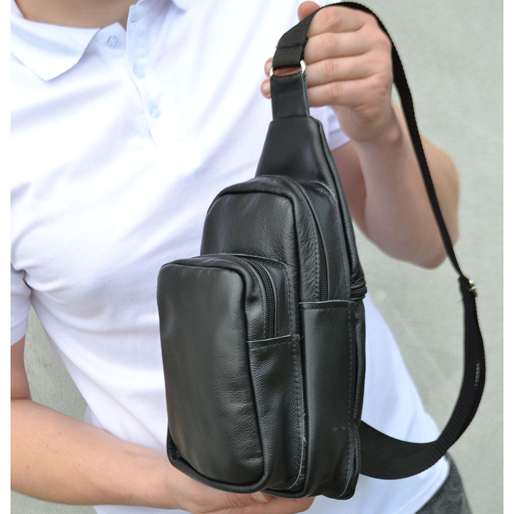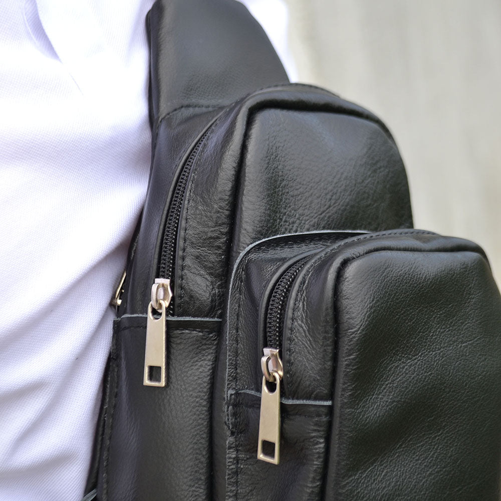 Стильная мужская сумка - бананка, слинг нагрудная из натуральной кожи на молнии чёрная
