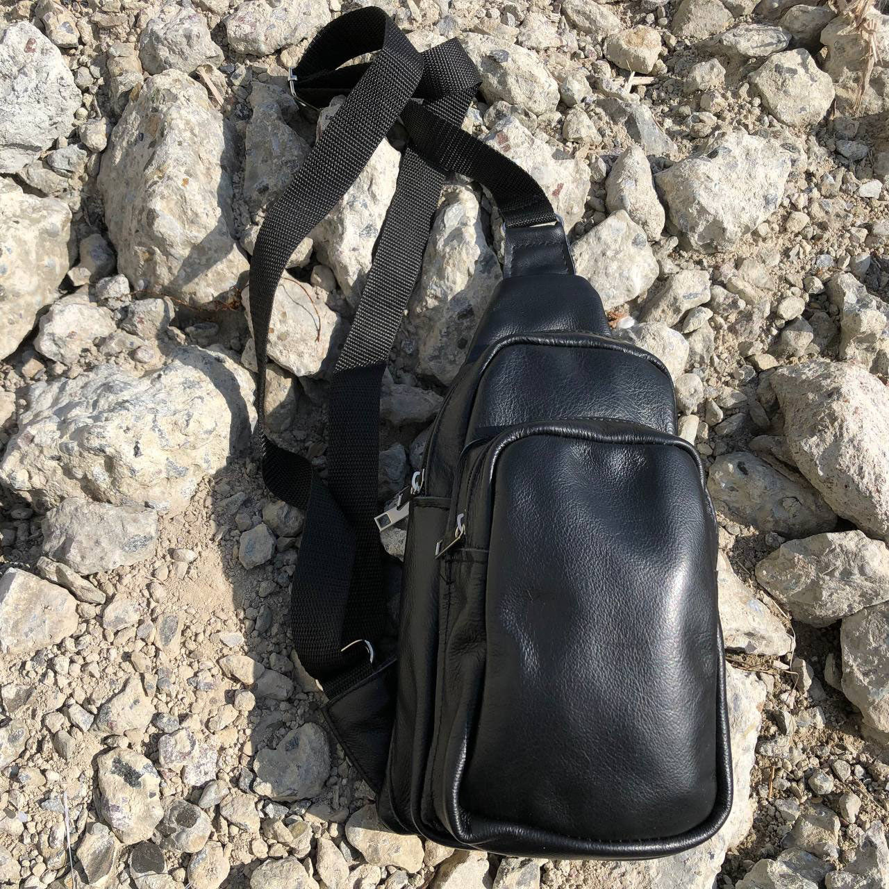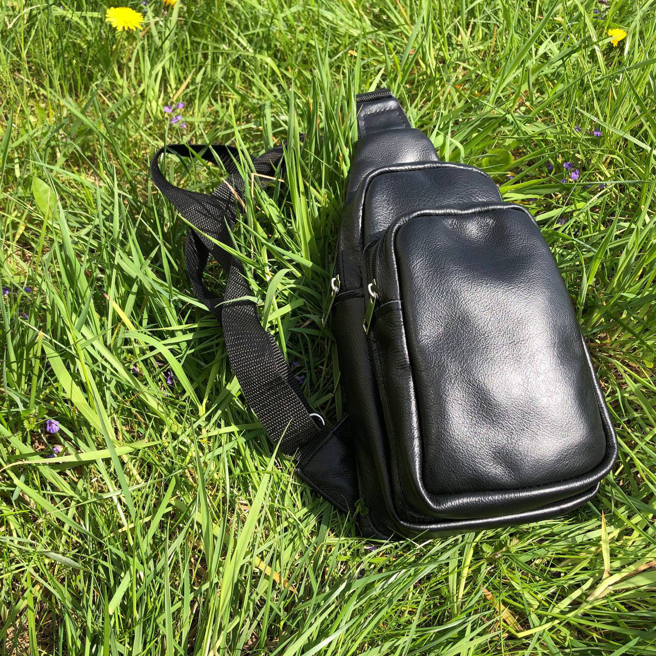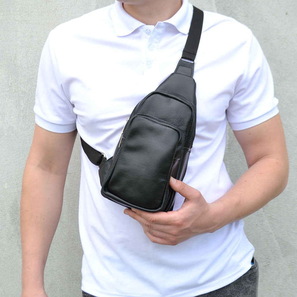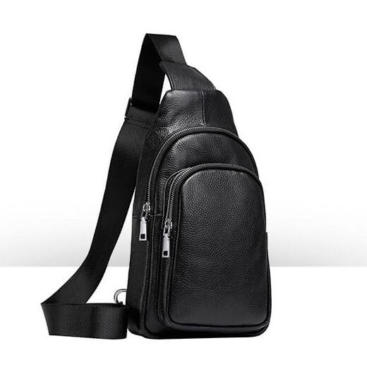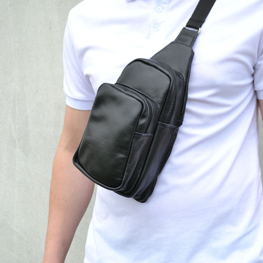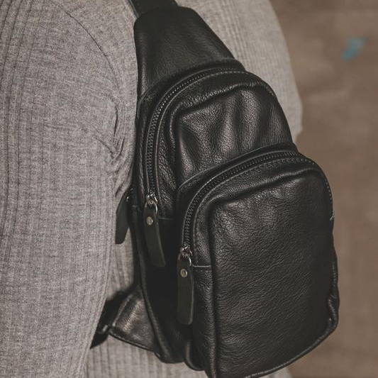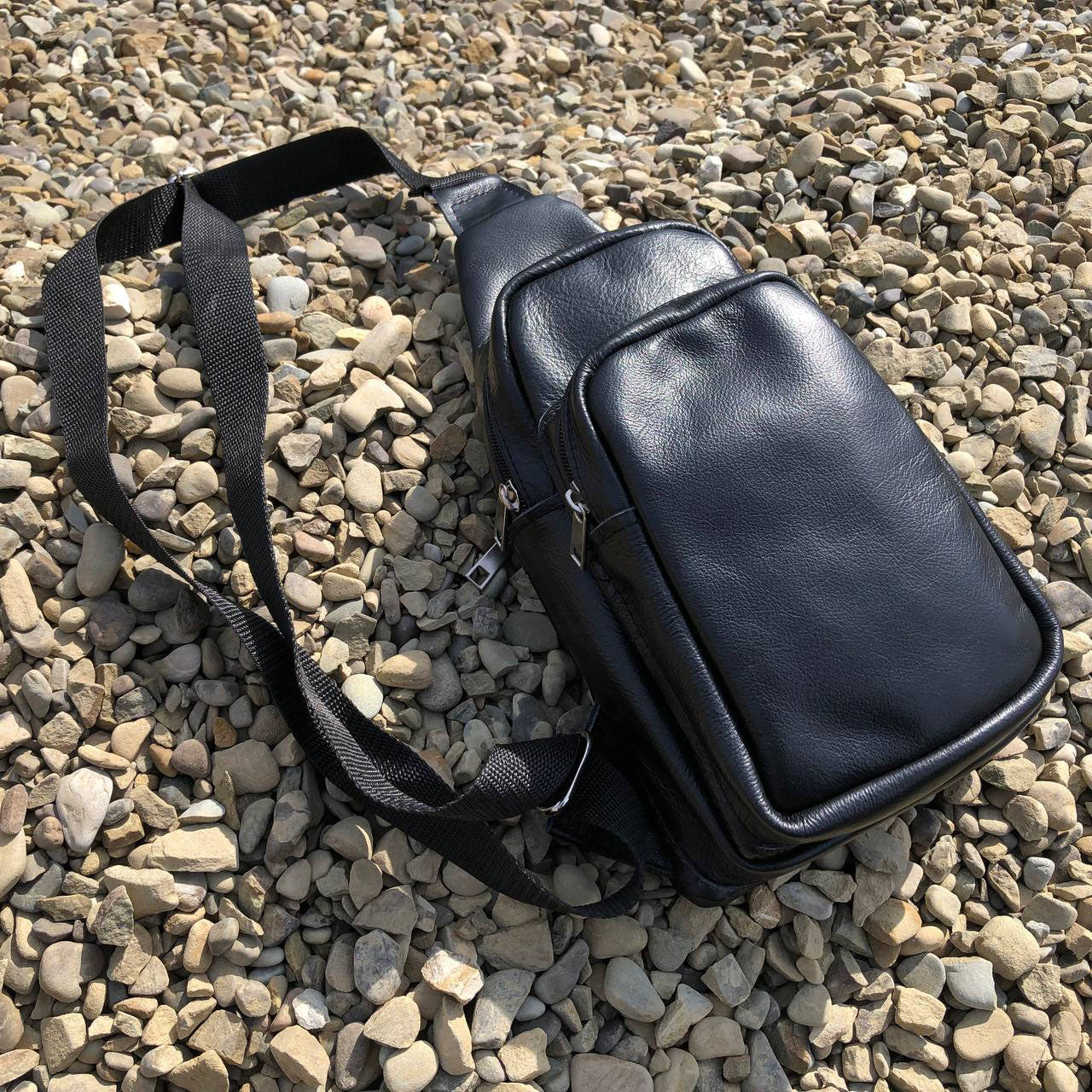 Стильная мужская сумка - бананка, слинг нагрудная из натуральной кожи на молнии чёрная
