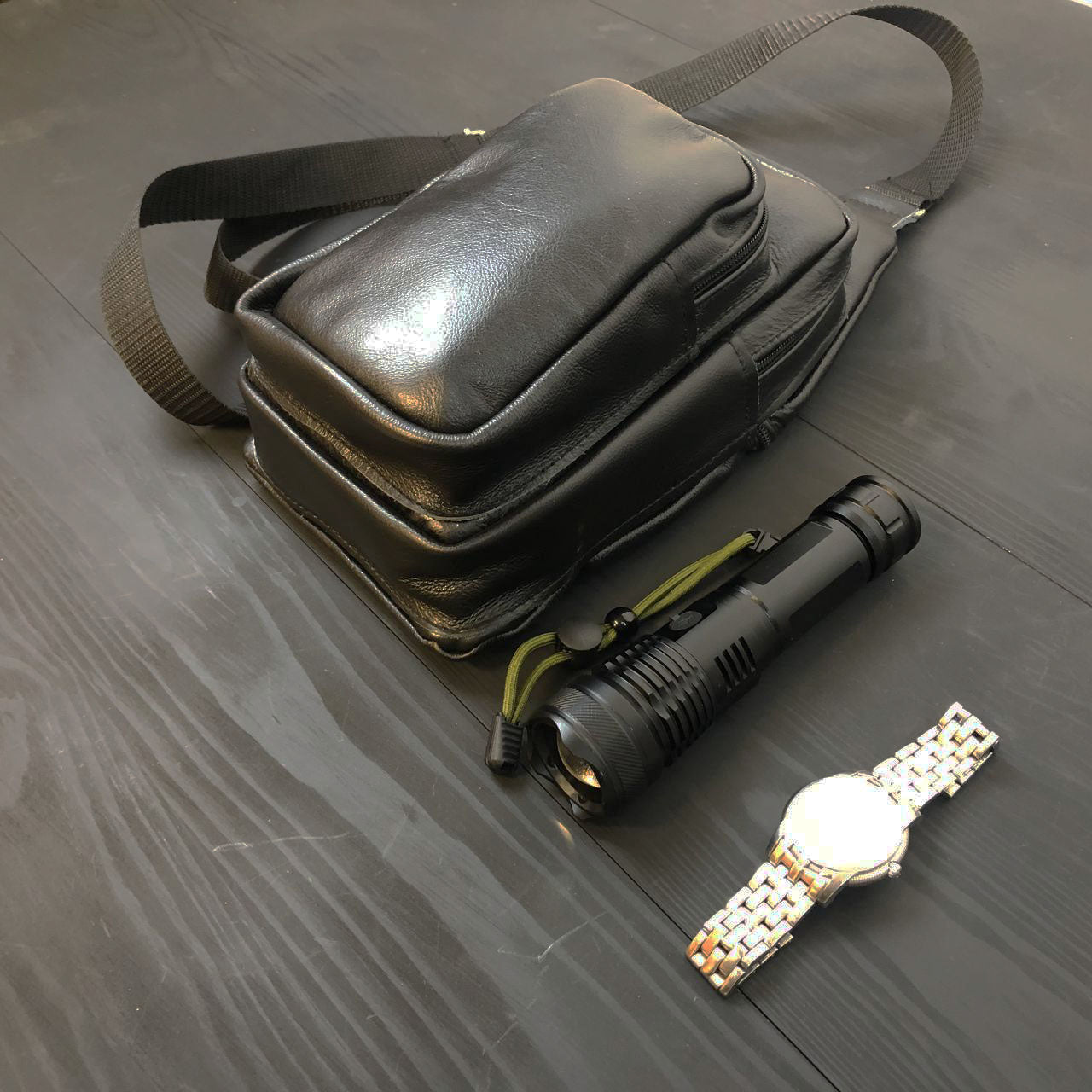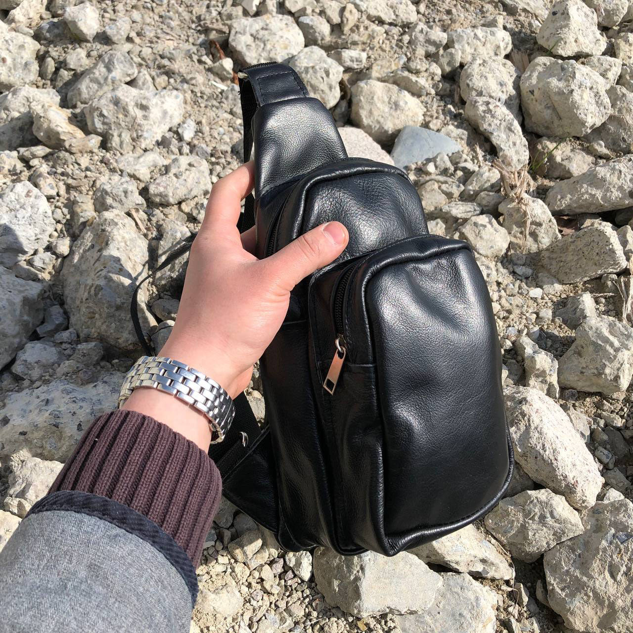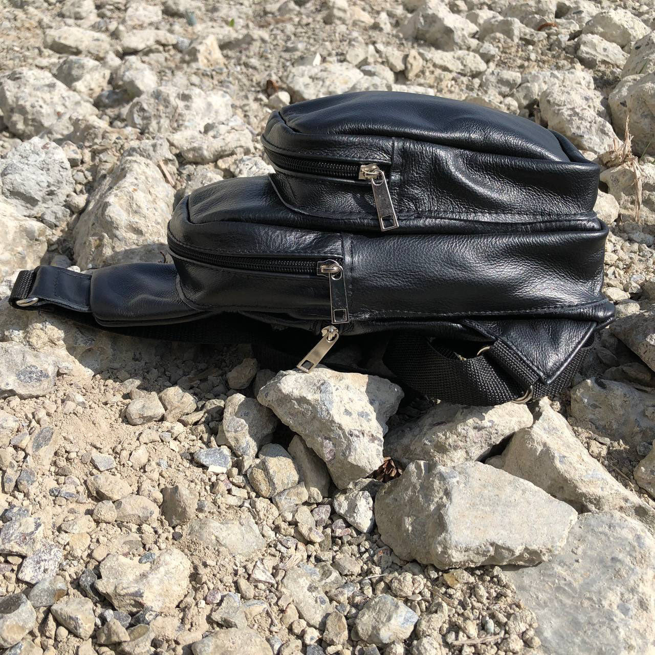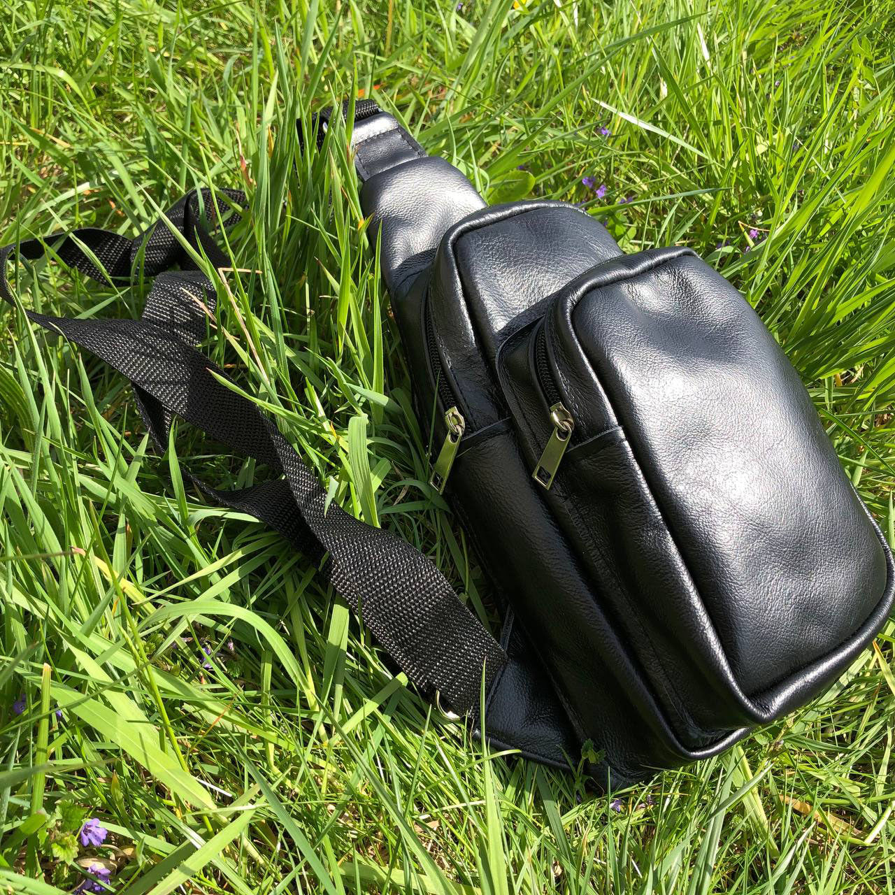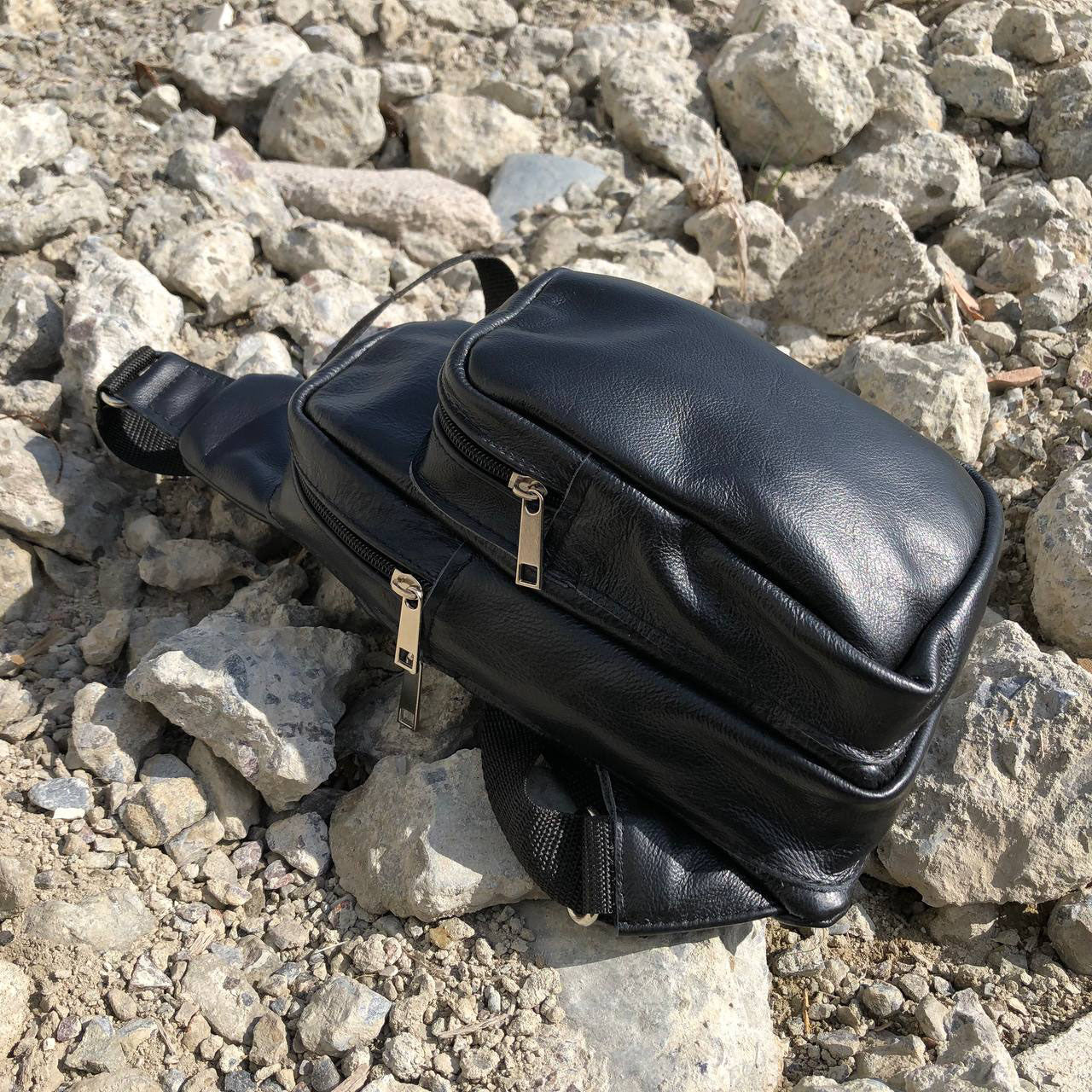Стильная мужская сумка - бананка, слинг нагрудная из натуральной кожи на молнии чёрная
