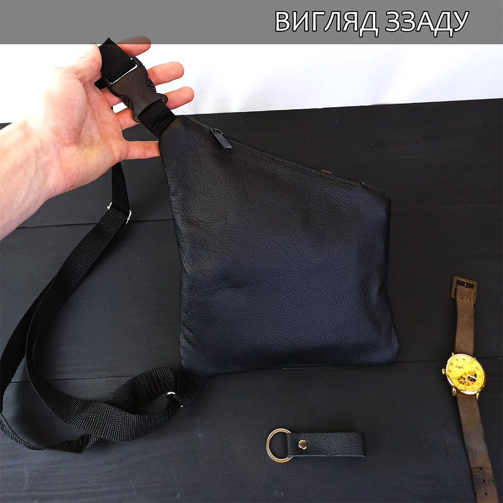 Подчеркните свой стиль с черной мужской сумкой-слингом из натуральной кожи. Этот небольшой и компактный аксессуар идеально подойдет для активного мужчины, ценящего комбинацию элегантности и практичности.